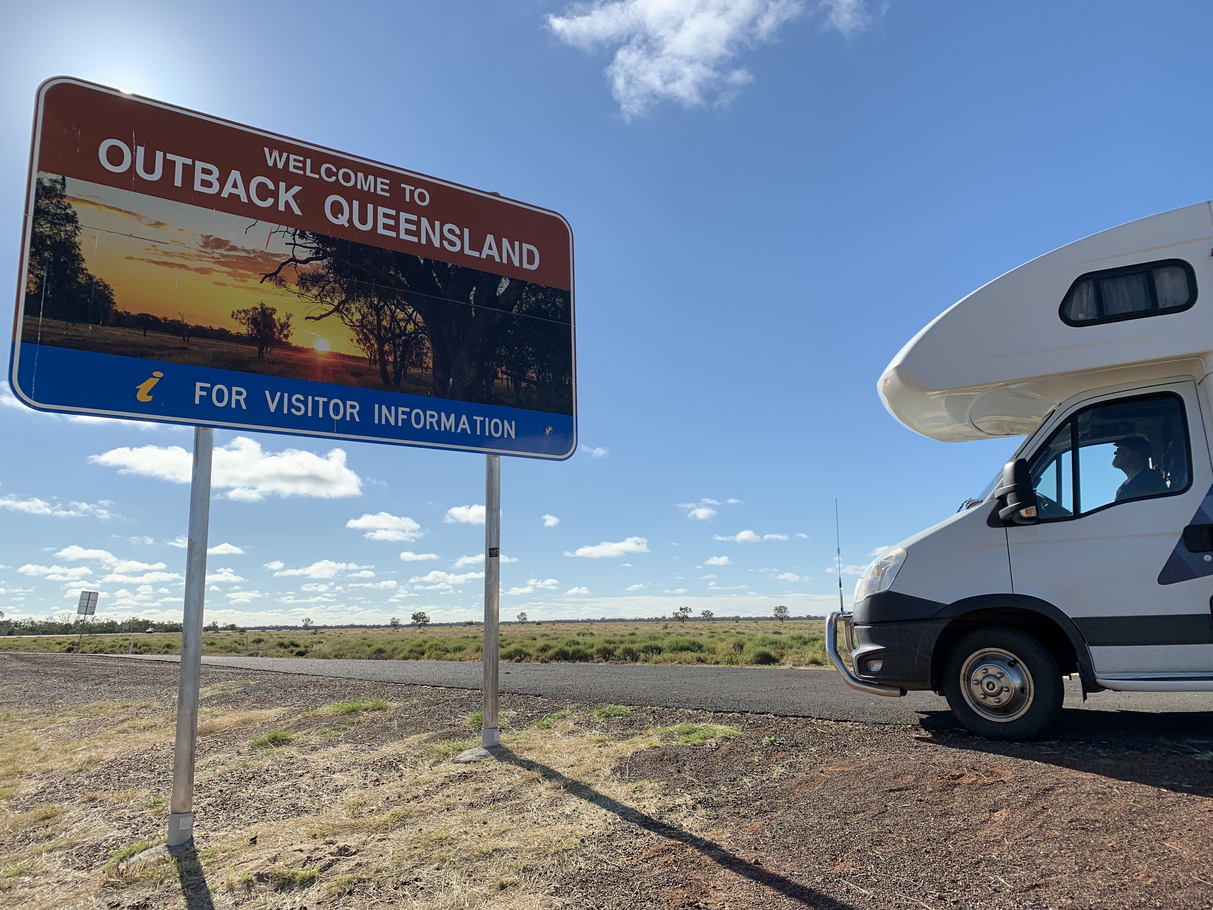 The countryside between Bourke and Cunnamulla is very flat and the road is long and straight. We didn’t see much livestock, only a few goats and Emus. When we reached the border at Berringun we stopped to take photos of our border crossing. There were no officials manning the border to check if we had the correct travel pass.