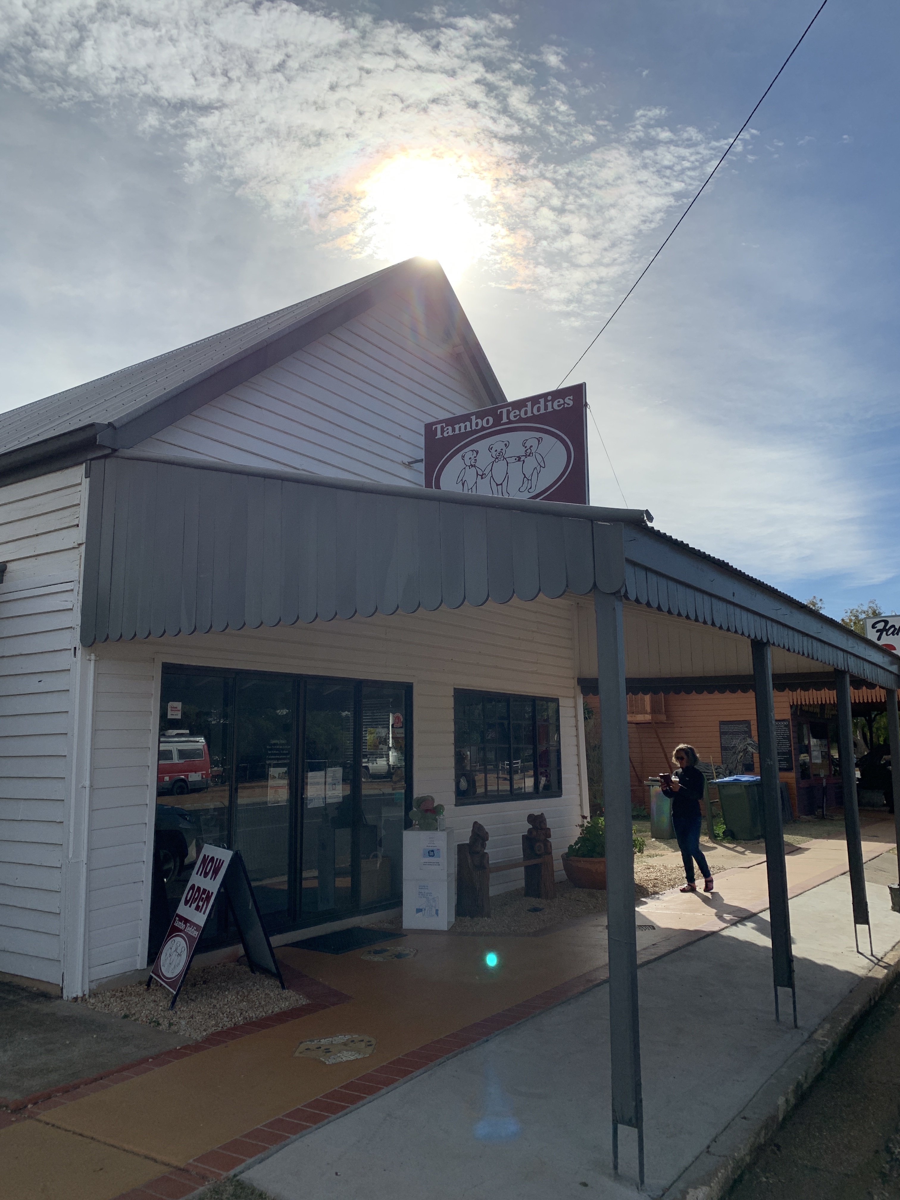 We filled up with fuel and then spent an hour or so exploring the little Main Street of Tambo. Tambo is famous for its Tambo Teddies. This is a local success story. Tambo Teddies was born in 1993 when three local ladies decided to assist the ailing wool industry, encourage tourists and create employment by making teddy bears from wool pelts and stuffing them with wool. Tambo Teddies took off. The teddies were a big hit. The last of the three ladies retired in 2014 and sold the business to two other local ladies and these two are continuing the tradition of Tambo Teddies.