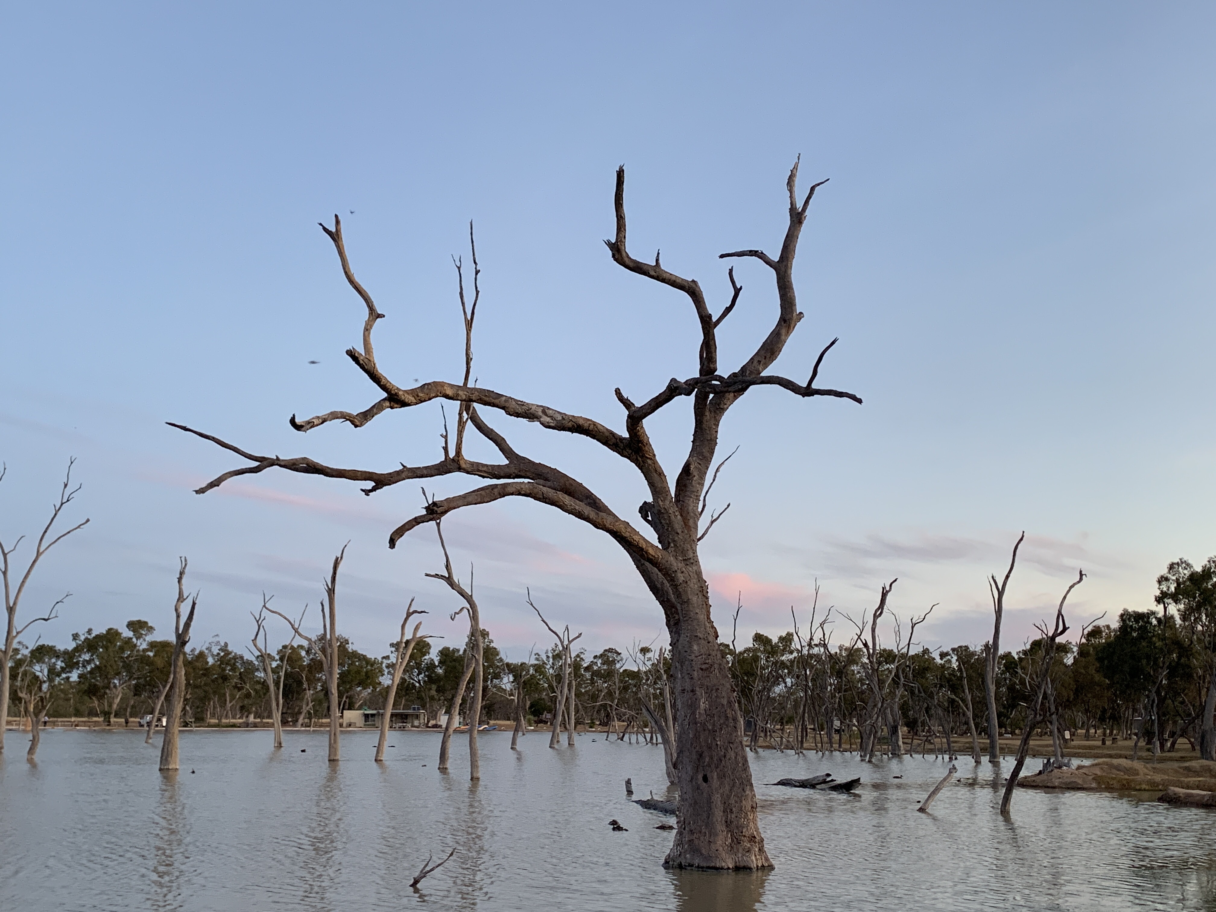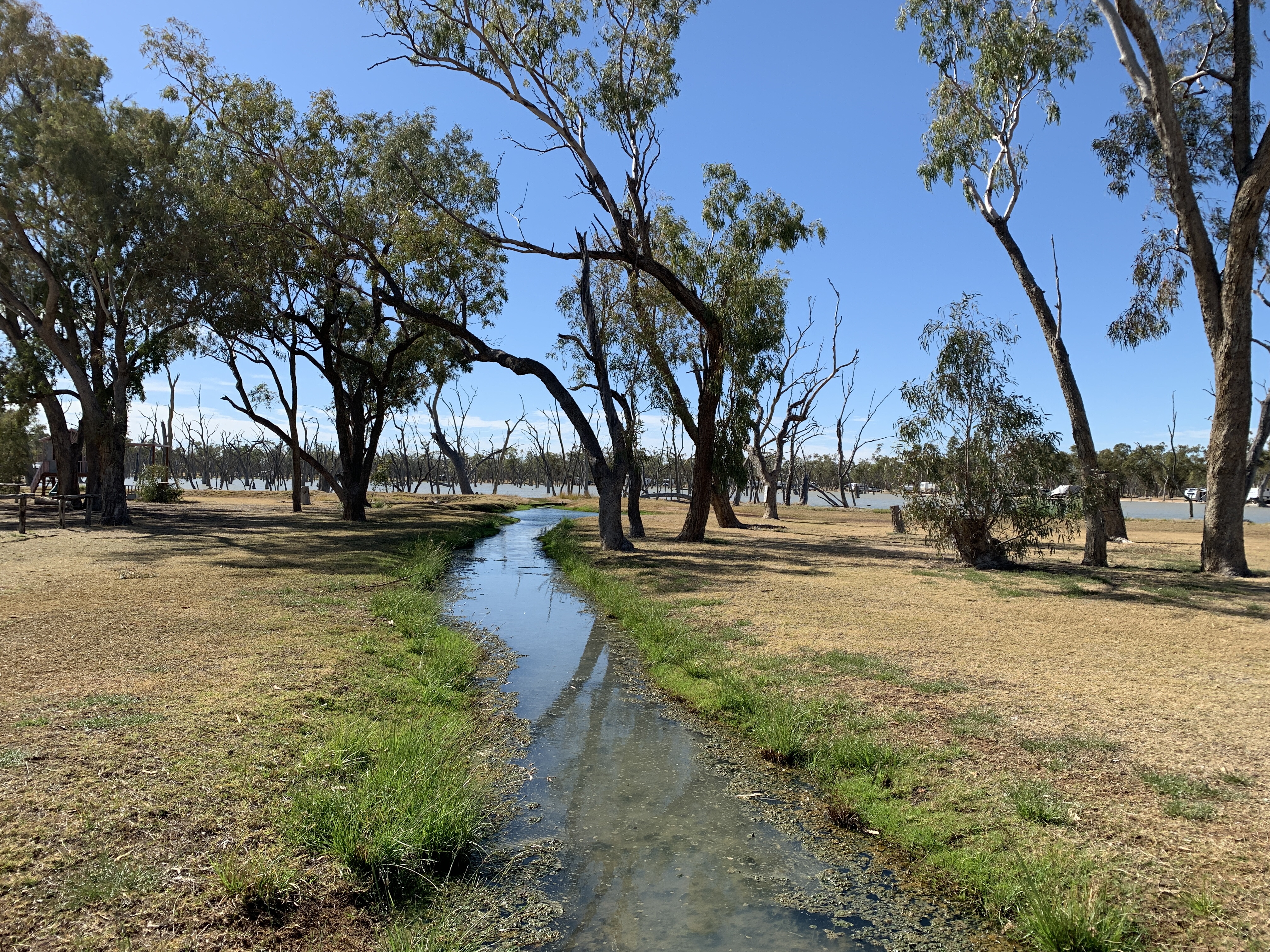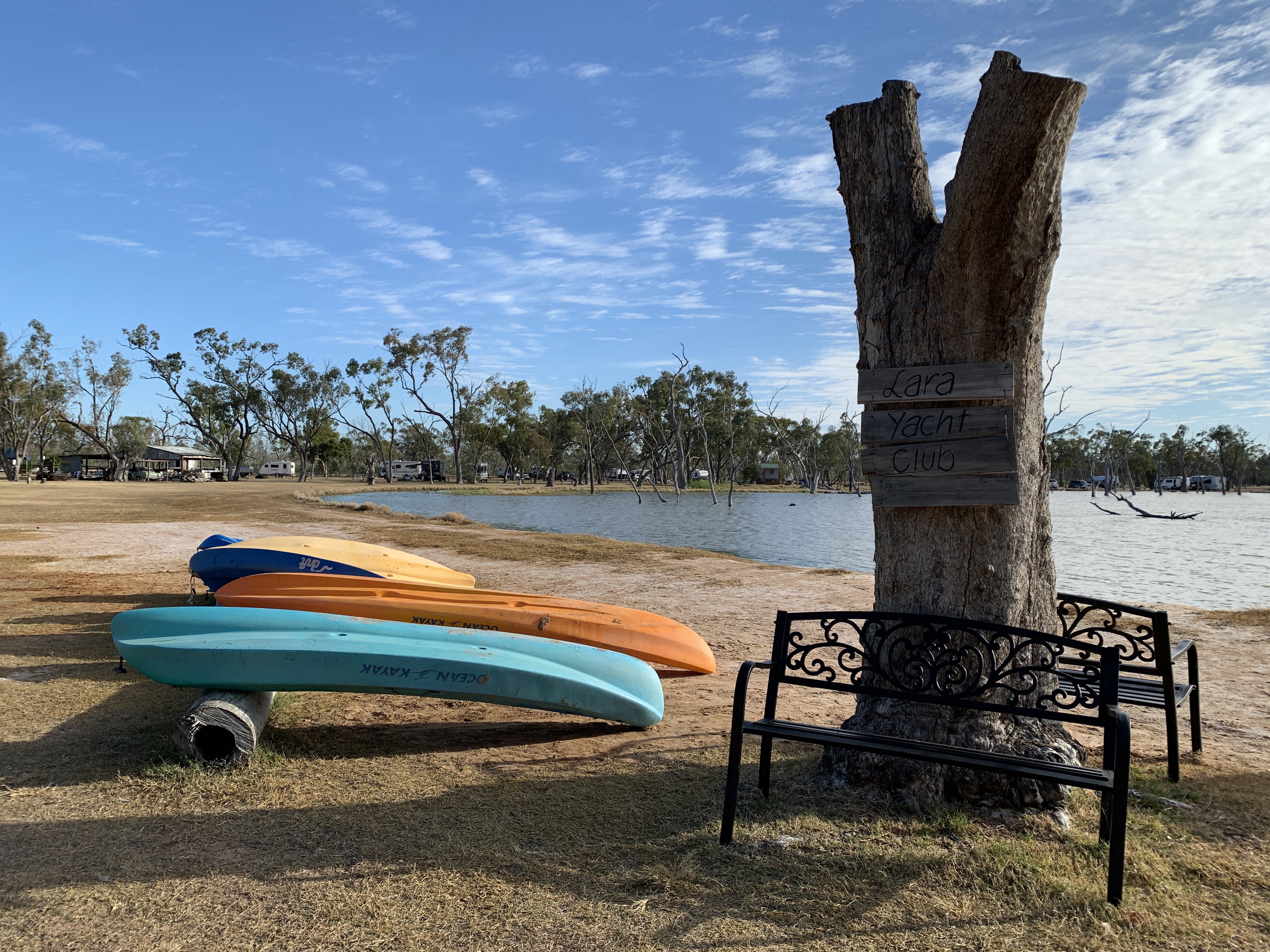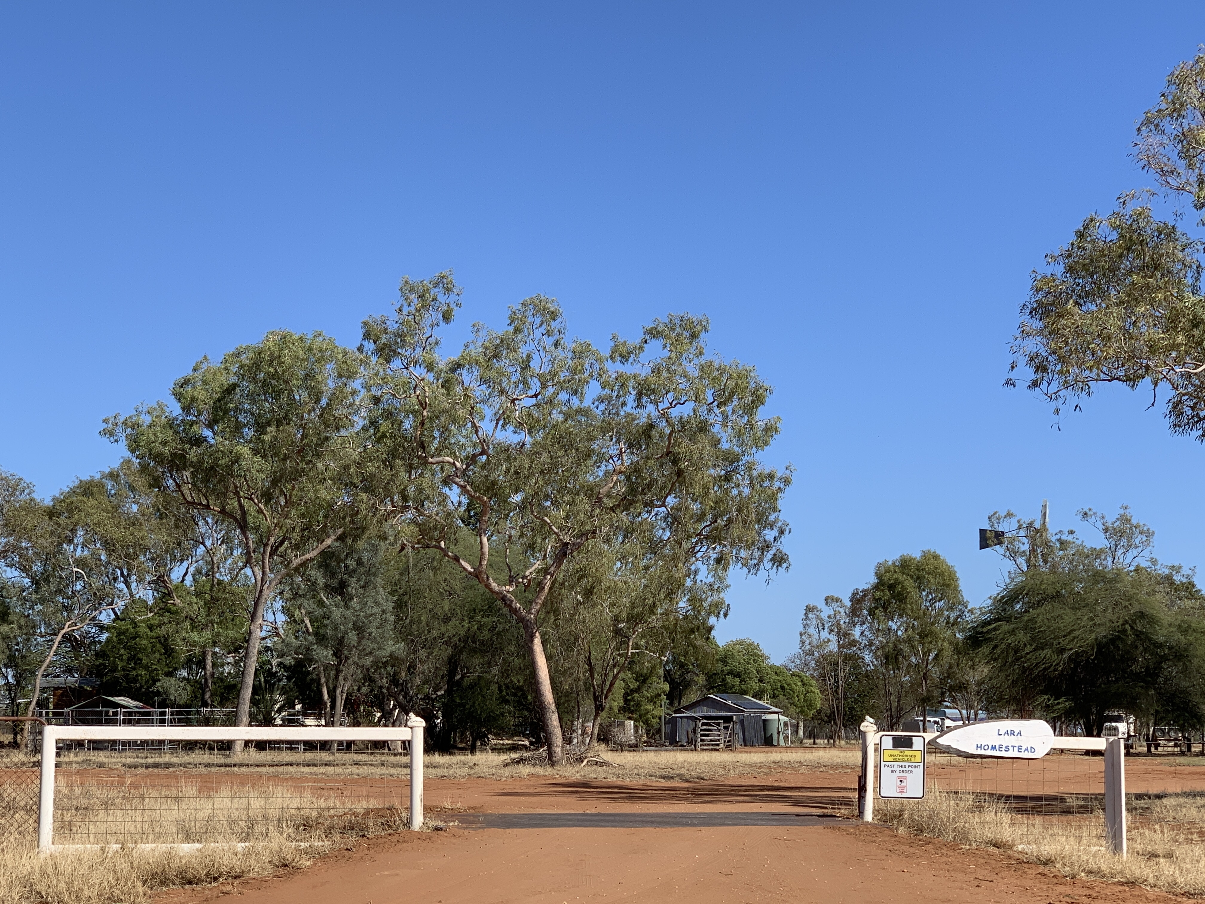 We left Blackall and continued heading northwards for another 78km and then turned off towards Lara Wetlands Campground. The road in to Lara is a dirt one and it was quite corrugated in places. It’s only 13km but it took us 1/2 an hour to travel in to the main entrance. What a surprise it is to arrive. To get there you travel through very dry red sandy scrub and all of a sudden you are greeted by this large body of water teeming with bird life. It’s magic. The roughly circular wetlands has been landscaped in such a way that it all looks natural. The area was originally a natural depression so it didn’t take much imagination to enlarge it. There is an access road all around the wetlands and campsites all the way around as well.