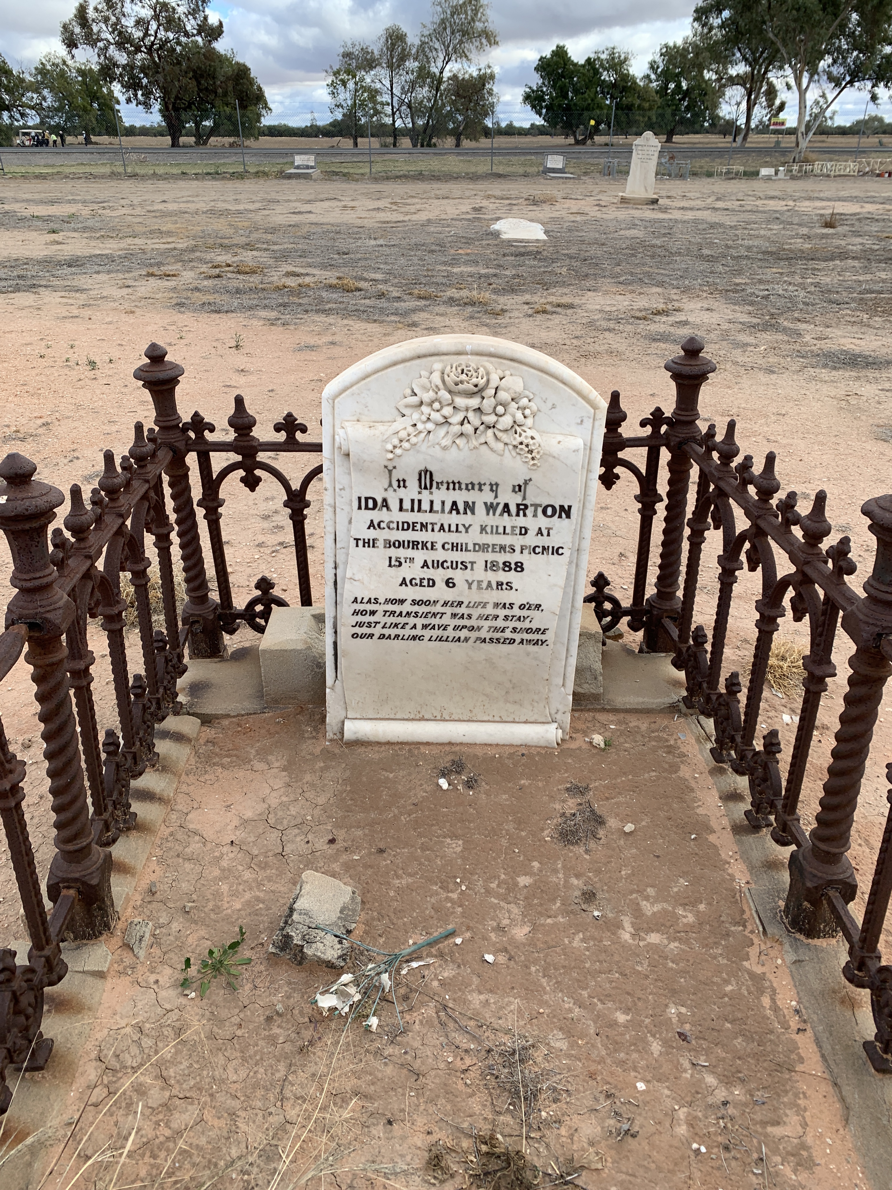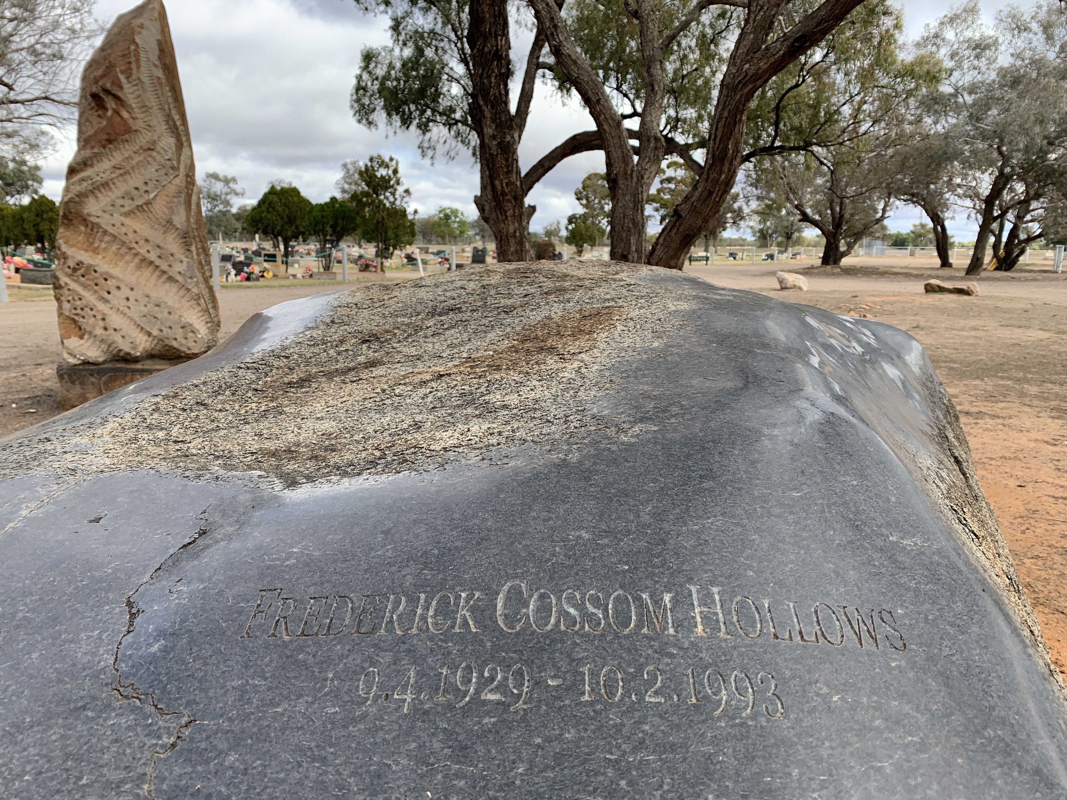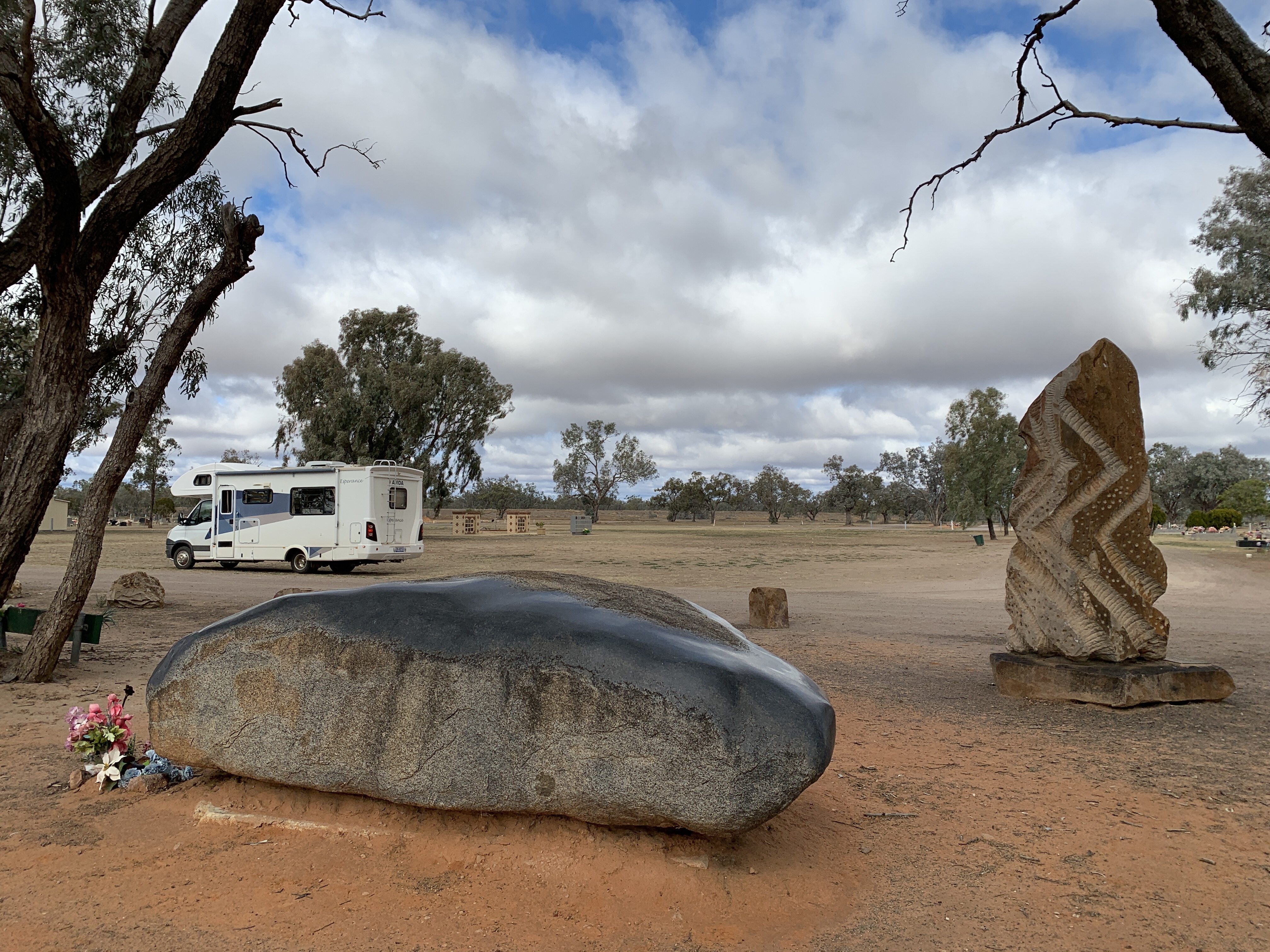 We arrived in Bourke on Friday 18 June 2021. Our first stop on arriving at the outskirts of the outback town of Bourke was the Historic Cemetery. This was a fascinating place to visit. The Historic part of the cemetery is the burial site of many of the districts pioneers. You can pick up a brochure that includes a map that guides you to some of the most significant graves. The most famous person buried here is Professor Fred Hollows. Fred was an eye doctor and became famous for his treatment of cataracts mainly working with indigenous and the poorer people in communities. Fred loved Bourke and its people and it was his wish to be buried in Bourke. His family have had a huge granite rock placed over his grave with his name engraved on it. It is their wish that people touch, climb and sit on the rock.