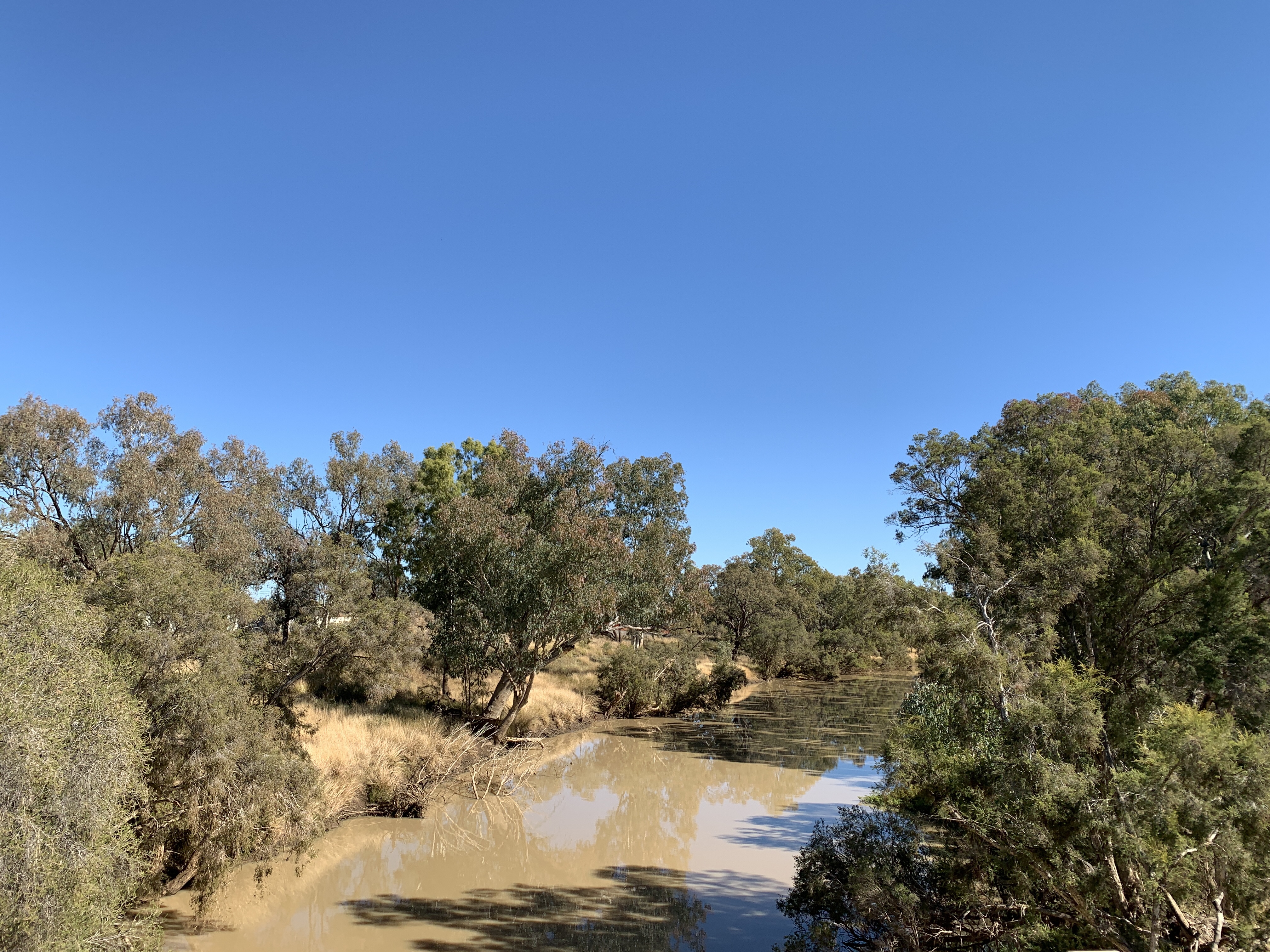 I found what looked like a good spot to stop for lunch on WikiCamps and we eagerly looked for a pole on the side of the road that had tinsel wrapped around it. This was the marker for a track down to the 10 Mile Waterhole. We found the tinsel-wrapped pole, followed the track down to the river and enjoyed a nice lunch break with water views of the Warrego River. I do love a water view. I think I might have said that before!