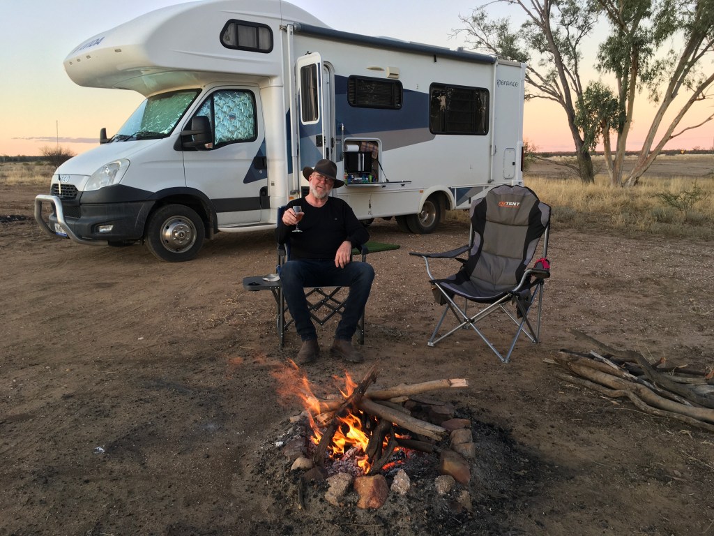 We arrived in Tambo in the late afternoon and headed out along the Barcoo River to find a camp. It was around 5ish by this time and most of the good spots were already taken by campers but we found a spot right at the end and set up camp. Sadly the Barcoo River is empty so we didn’t have water views for this camp but we did enjoy a roast pork baked dinner, a lovely campfire and watched the sun go down on the low, flat horizon.