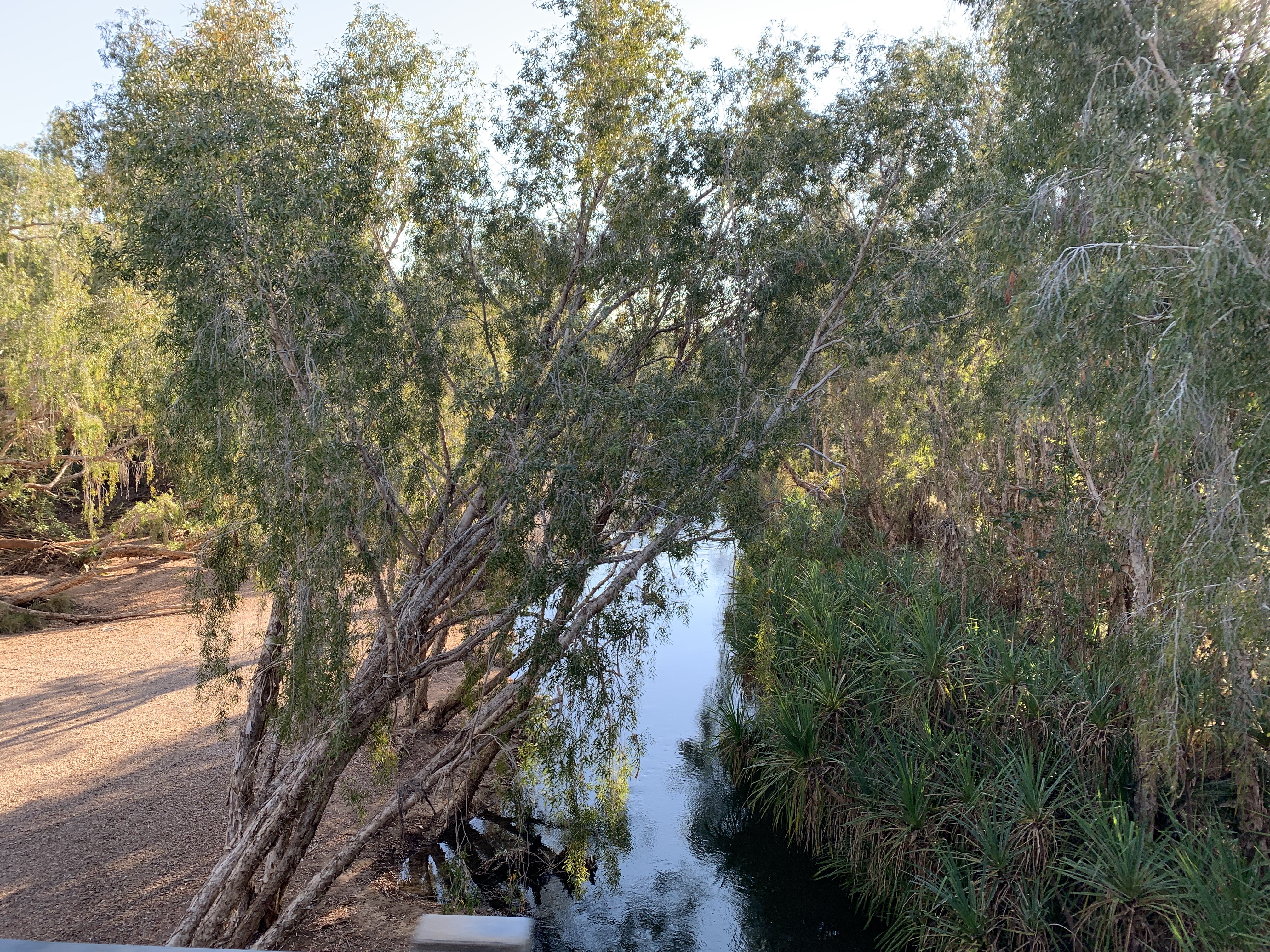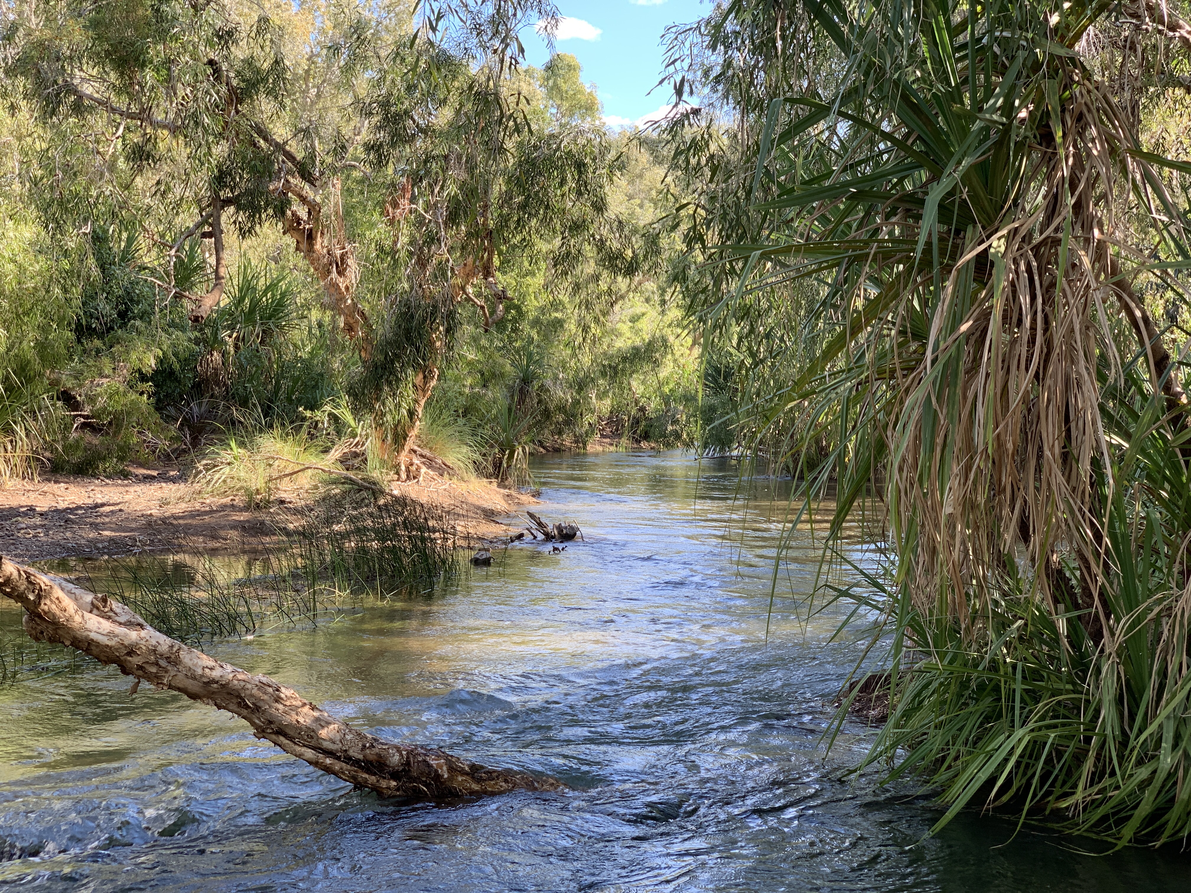 After setting up camp we donned our swimmers and headed straight to the river. OMG the water was freezing but so refreshing on a hot afternoon. The bottom is sandy with lots of round rocks and pebbles. The water is crystal clear. The river is lined on both sides by cabbage palms, pandanas and tea trees with deep sandy banks. It is an outback oasis!