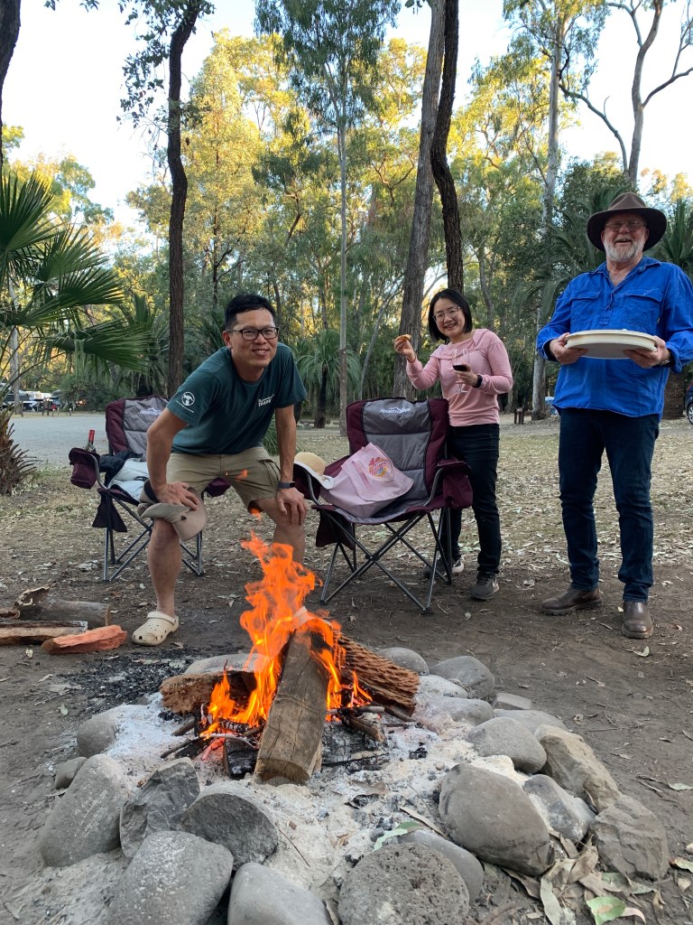 While we were sitting outside reading our books one of our neighbours that we’d sat next to at the bar the other night, Tony, came over to see if we had any matches. He had never made a camp fire before and wanted to give it a try. Richard asked if he wanted some help so off they went to organise a camp fire. At Takarakka you can have a camp fire but only in their designated fire pits. Tony chose the fire pit that was closest to the bar area and around 5pm we took our chairs and some drinks and nibbles across and set up around the fire pit.