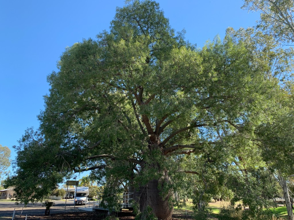 Our first stop in Roma was to check out Roma’s Big Bottle Tree. It is enormous. It has a height of 6m and a crown of 20m and the trunk is 9.51m in diameter. Bottle trees are planted all around Roma. They are not to be confused with Boab trees, although both get called bottle trees. They are different species. Australia has 12 species of Bottle trees however there is only 1 Boab. The Boab is only found in the remote Kimberley region in the northern part of Western Australia. Boabs are one of the oldest living things in Australia and in the rest of the world. The bottle trees planted around Roma are Queensland Bottle Trees or Narrow-leafed Bottle Trees and as they age the trunk becomes fatter and ‘bottle’ shaped’. The trees are not hollow and the swelling is due to water being held in the fibrous truck. They are very long lived trees and can live naturally for over 200 years. Roma’s Big bottle Tree was transplanted from a local property in 1927 and is over 100 years old.