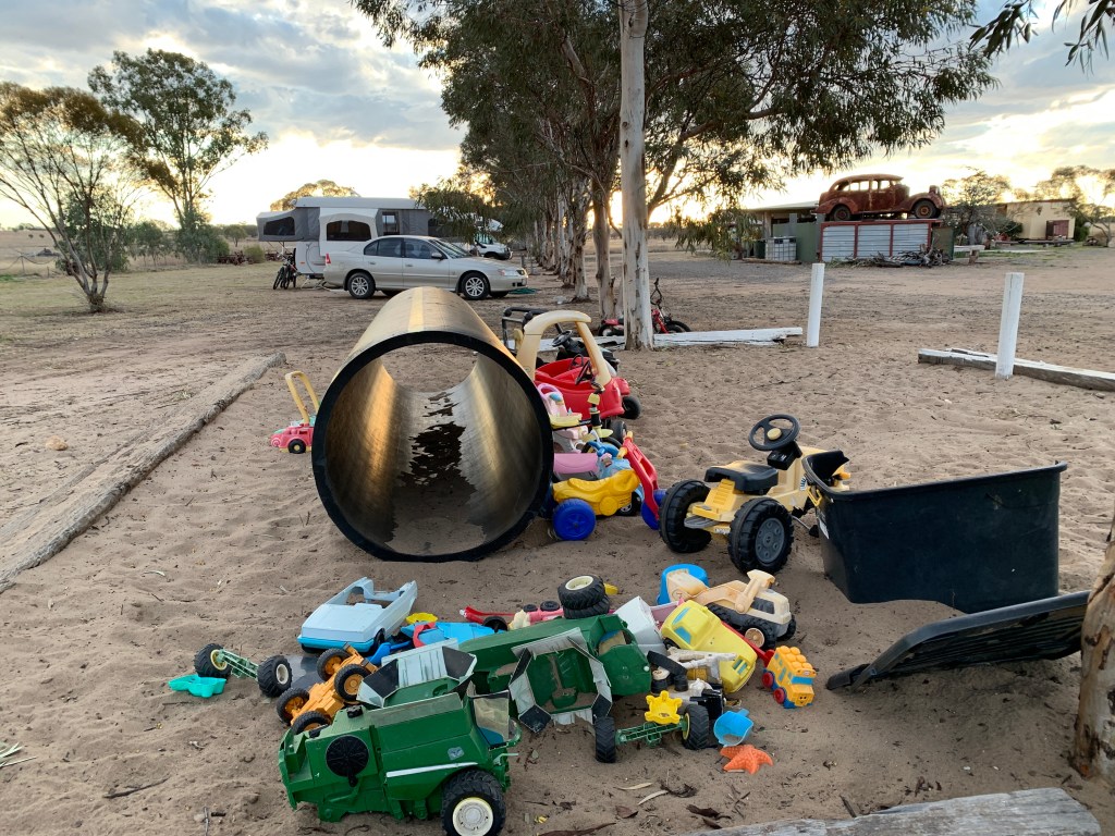 We camped the night at a farmstay we found on WikiCamps called Ups & Downs Farmstay. This is a small caravan park about 6km out of town on a 200 acre working farm. They’ve turned their front paddock into a small caravan park with 10 powered sites and 14 unpowered sites. They also have a donga with three rooms and a shared bathroom. There is a rustic camp kitchen and another donga set up near the camp kitchen with 3 unisex bathrooms and a laundry. The place was almost full when we arrived and were greeted by the resident caretaker. It cost $20 for an unpowered site but each site has access to a water tap.