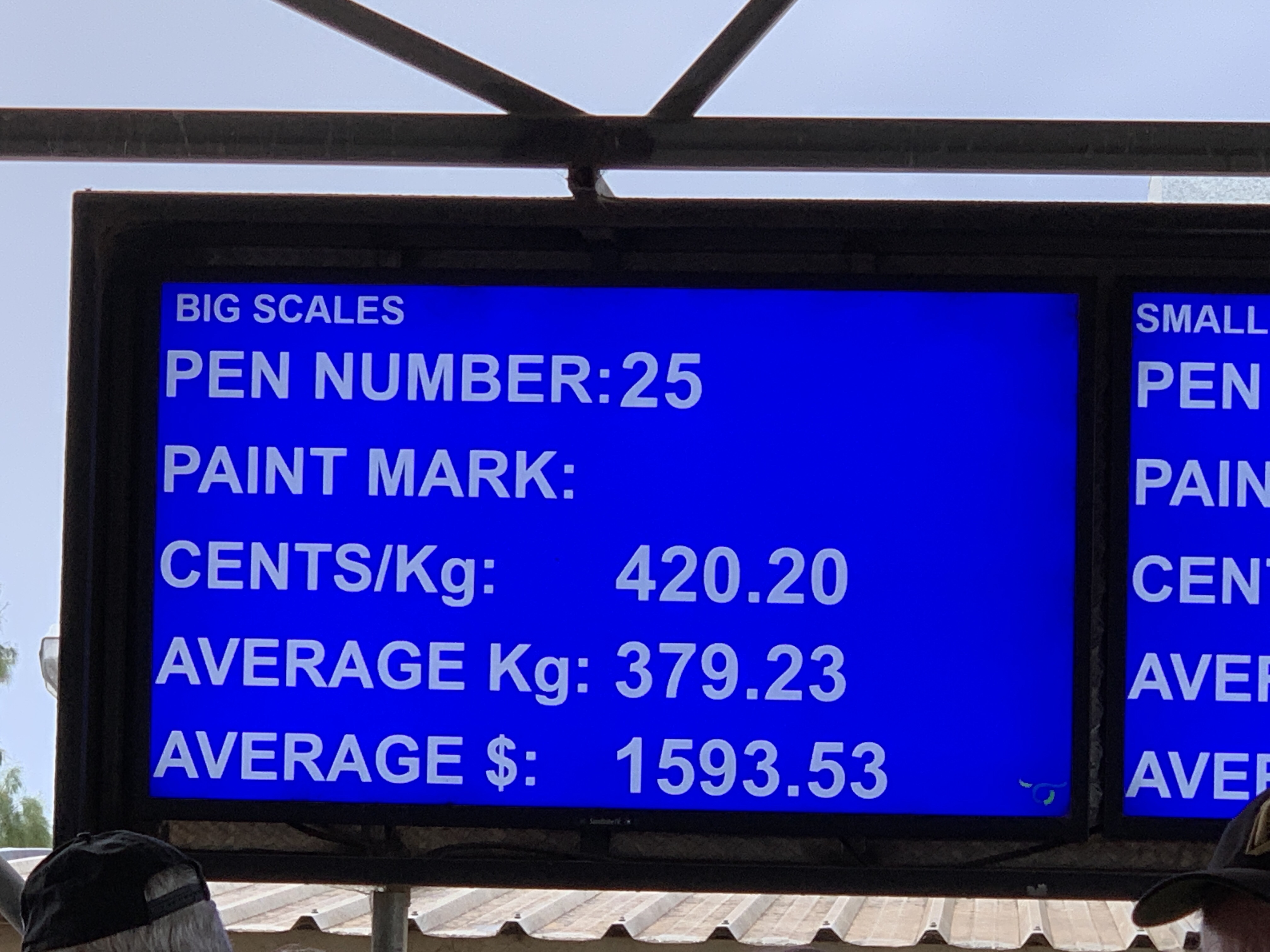 Once the pen of cattle are sold they are moved along the lanes and into the weighing scales. Roma has two scales, one big one and one small for smaller pens of cattle. The cattle are herded into the scale where the gate closes behind them then the entire pen is weighed and the average weight and average price per beast is shown on the electronic board based on the cents per kilo that the buyer earlier agreed to.