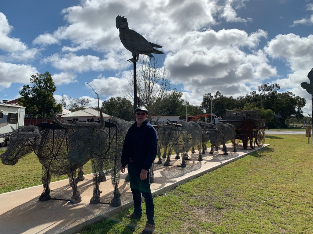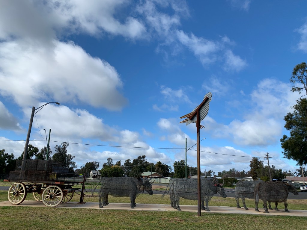 We arrived in the tiny town of Gulargambone and stopped to have a look at the fabulous bullock sculpture. The sculpture is the work of local Coonamble Brian Campbell who has created a bullock team pulling a wagon. the six individual bullocks are made from steel rod and recycled wire netting and the sculpture took 6 months to complete. It is really impressive.