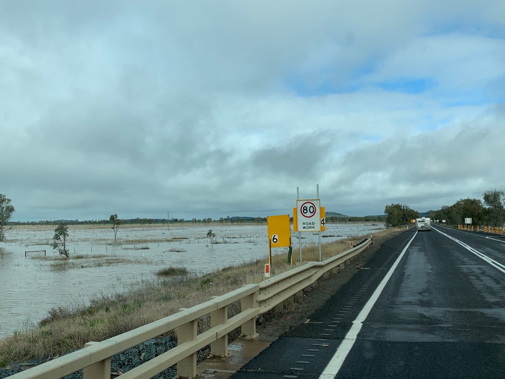 It was such a miserable rainy day and cold. It was only 11 degrees after lunch. We had to park a couple of blocks from the pub and it was miserable walking back to the motorhome. As we crossed the big bridge over the Macquarie River in Dubbo we saw the river was very full. Major roadworks were being done to the intersection of the Newell and Mitchell Highways so it was slow going getting around the corner.