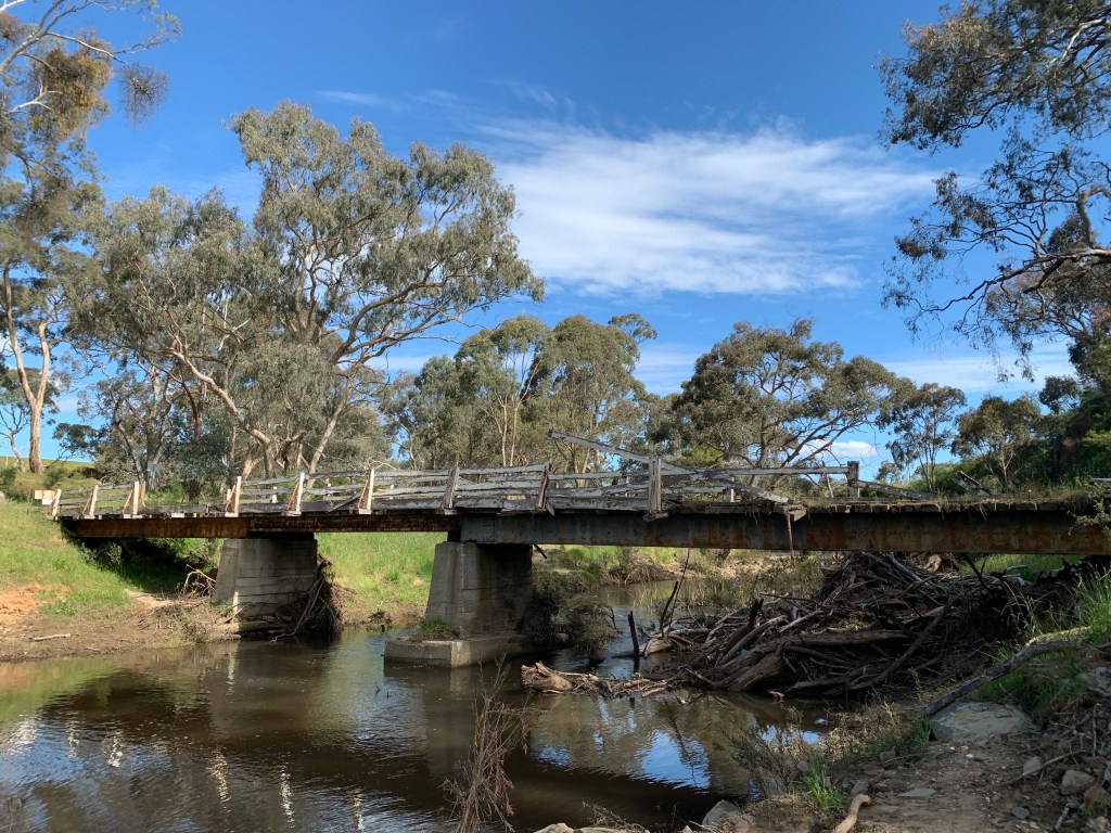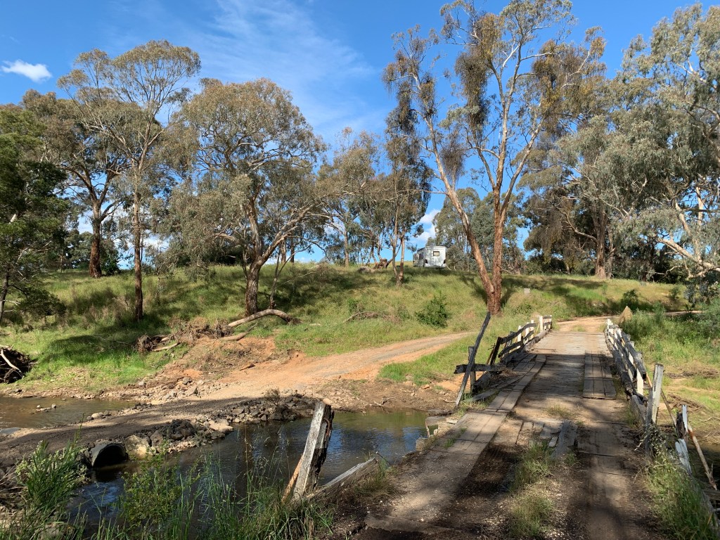 Around 4pm we started looking for a camp and found another great spot via the WikiCamps app at Franklinford Streamside Reserve. What a lovely spot. The road was a bit narrow and bumpy on the way in and there weren’t too many level spots but we managed to find a spot up high on the hill overlooking the fast rushing stream below. There were roadworks below that indicated the creek had flooded recently and the ford was under repair. It looked like it had been washed away and a lot of new rocks had to be brought in. It is a one way road in and provides access for the people who live on the farms along the way. We watched a few cars cross the precarious bridge and make their way to the other side. You wouldn’t have got me to drive across that rickety bridge! We had a little campfire and enjoyed camping there.