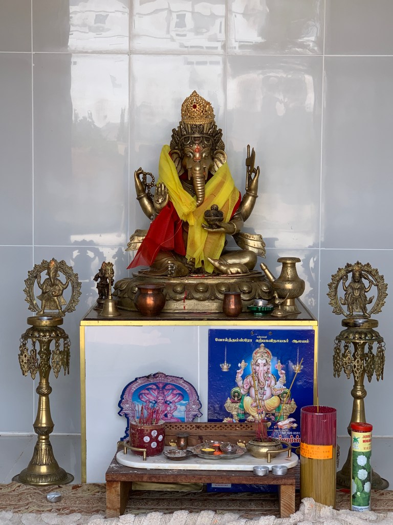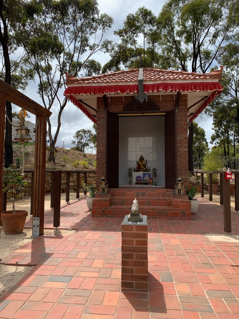 Entrance roadNepalese style temple to the Hindu God, GaneshHindu God GaneshQuan Yin, a female aspect of the Buddha. Statue is 7m tall and sculpted in Vietnam in poly-marbleLife-size statue representing the four harmonious friends, a Buddhist teaching about working togetherBahai starPrayer Wheels. E ach wheel contains 20 million mantras. Spin them clockwise. Hand-made in Nepal from copperGolden Thai BuddhaHeart Sutra Wall, English one side, Vietnamese the otherSt Francis of Assisi, Catholic patron saint of the environment and animalsDzambhala symbolises richness in all its forms and the power of wealth to benefit beingsIk Oannkaar – a sacred Sikh mantra