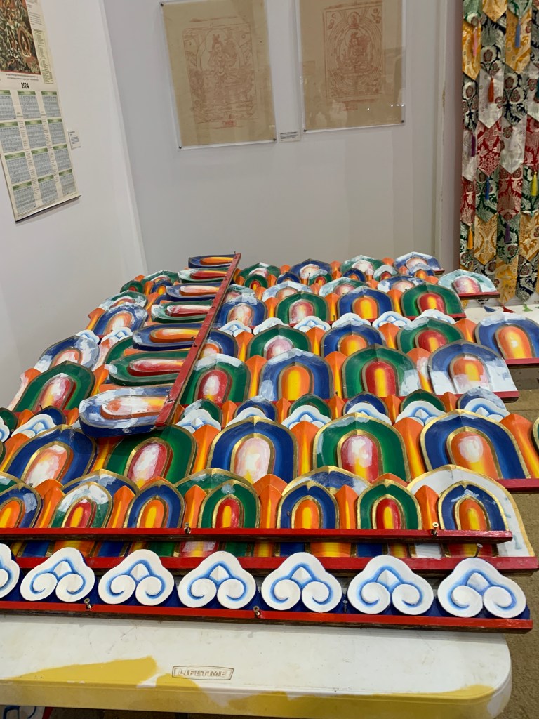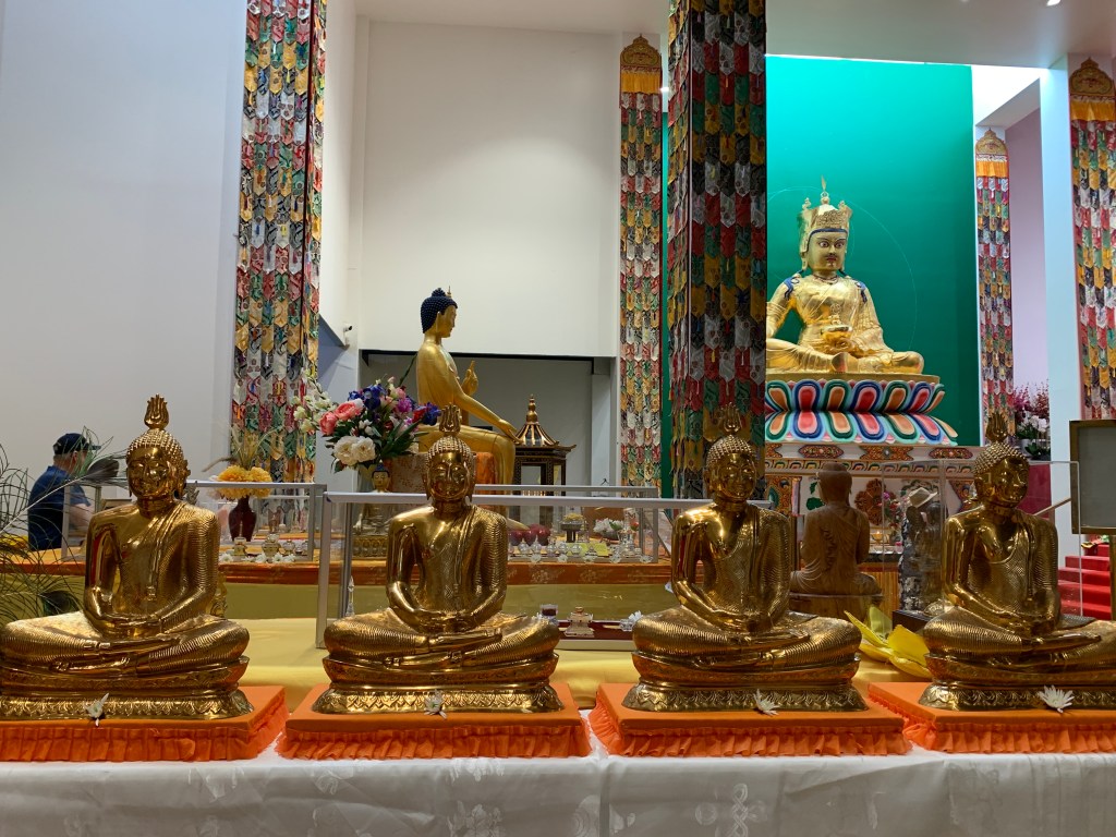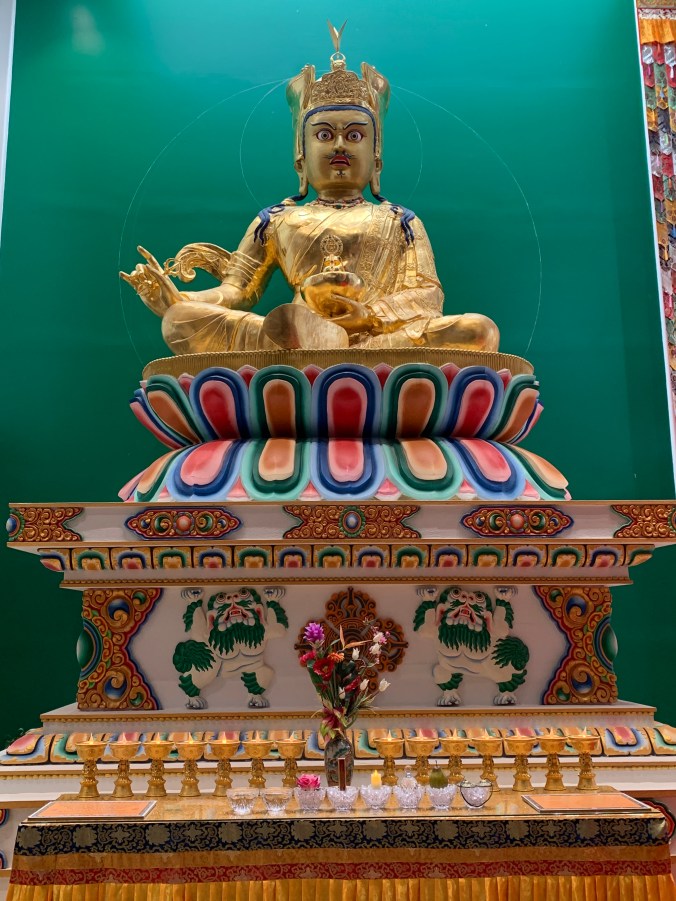 Guarding lionPrayer wheelsGreen Tara, a female aspect of the Buddha. Her purpose is to help living beings gain lasting freedom from sufferingBaby Buddha – pouring water over the Buddha and saying the mantra can help cleanse and purify our negative karmaUnpainted statueStatue being paintedPainted decorationsPainted decorationsPainted decorationsColourful silksThe Immense hallGuru Rinpoche, a 4m high statue made of brass and covered in 24 carat gold leaf. Blessed by His Holiness the Dalai Lama in 2007