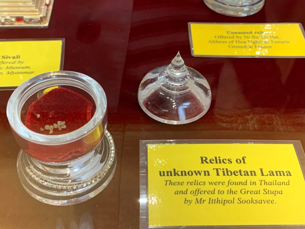 The Great Stupa also houses a huge collection of holy relics. These have come from all around the world. Relics are found in the ashes after a great spiritual master has been cremated. They sometimes look like crystals or pearls and are said to hold the essence of the holy person. These holy relics are venerated in Buddhism. Eventually it is planned that the holy relics will be housed on the sixth level of the Great Stupa.