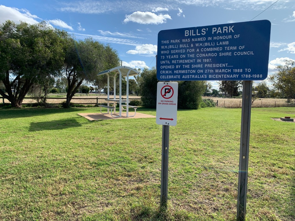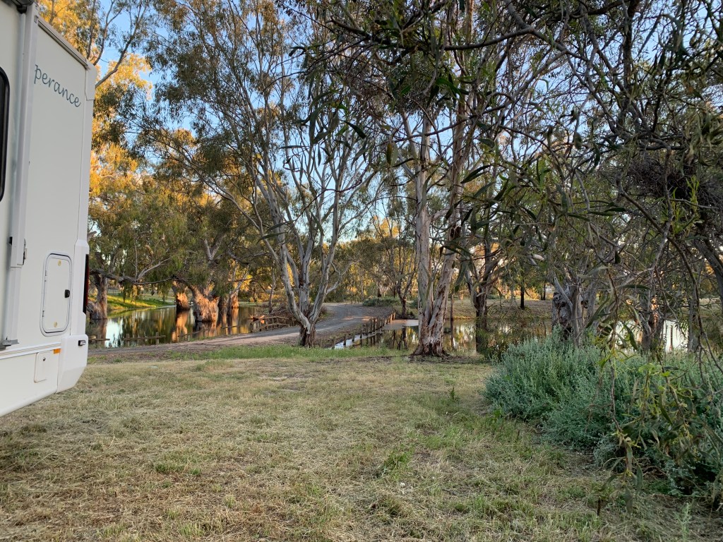 We continued on through Deniliquin and stopped in Conargo where we camped at Bills’ Park. Bills’ Park is one of two free camps in that tiny place. Little Billabong Creek was in flood but we managed to find a good spot with water views in front of us and also behind us. Bills’ Park is a lovely little park that is also home to the local Bush Fire Brigade sheds. There’s water available and a dump point, picnic tables and rubbish bins. You can even camp in tents.