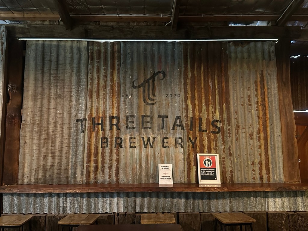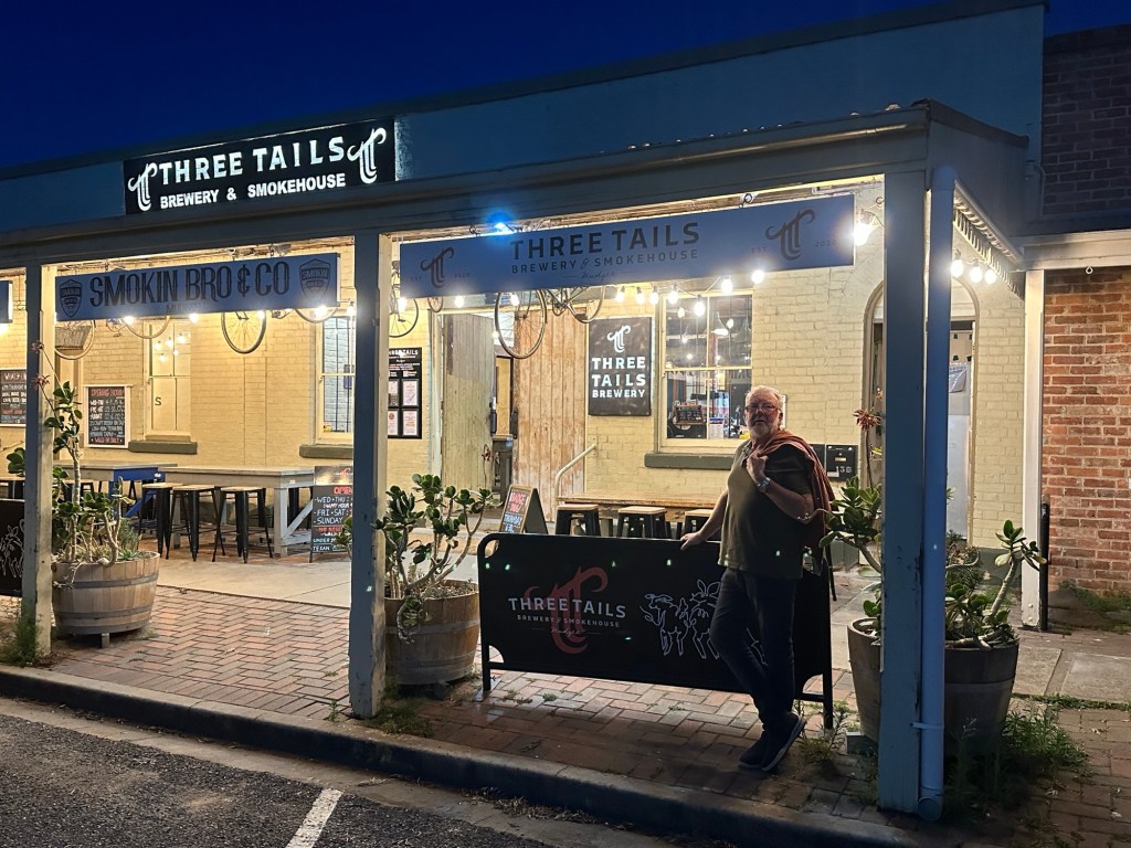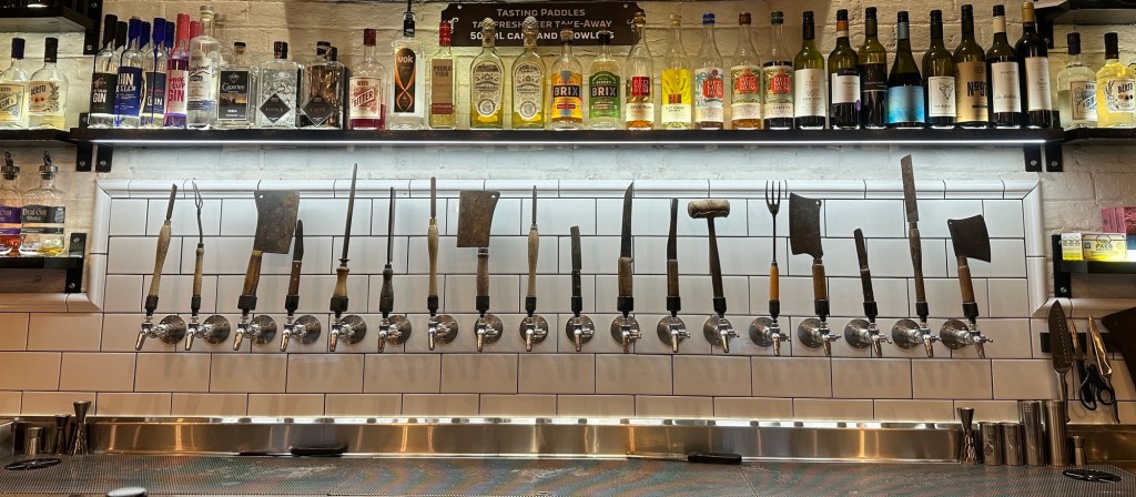 After a quiet afternoon we walked along the shared path next to the Cudgegong River and headed into town to Three Tails Brewery & Smokehouse. This fabulous boutique brewery sells their own craft beer on tap. They have 21 taps and they are the most unusual beer taps I’ve ever seen. Hope the knives are blunt!