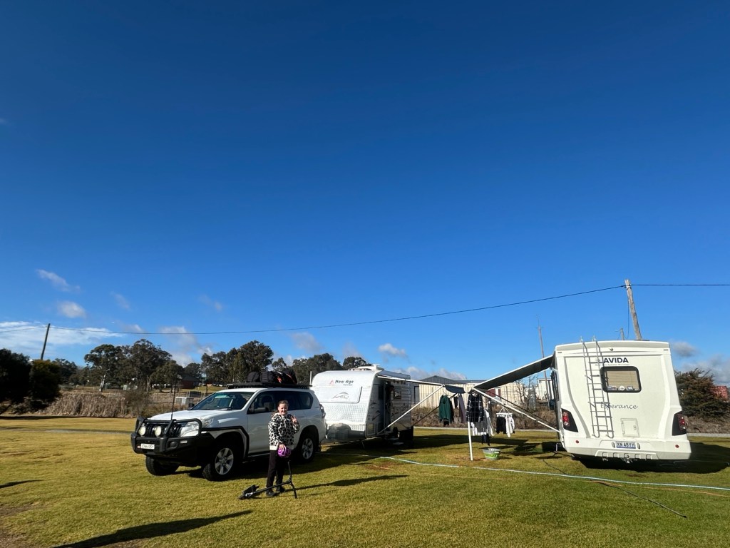 What a glorious morning we woke to at Tenterfield. The sun was shining so it was a good morning to get some chores done. Even though we are on holiday and travelling the chores still need to be done. Katie’s little wall mounted washing machine was doing its thing shaking her little van as it washed. I got two loads of washing done too and we hung it all out on clotheslines under our awnings to dry in the sun and the light breeze.