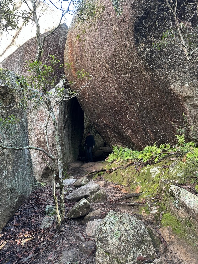 We unpacked the supplies and quickly packed up so we could head out of Tenterfield to Bald Rock. It’s only 27km. Along the way we spied the signage for Captain Thunderbolt’s Hideout and thought we’d better stop and have a look at that. There’s room to pull off the road for a few vehicles. There’s a large signboard that tells the story of the bushranger known as Captain Thunderbolt. Fred Ward was born in 1835 and in his early years was an excellent horseman. He was caught in a horse stealing racket, convicted and jailed for 4 years. He was arrested again and escaped from Cockatoo Island by swimming to freedom.