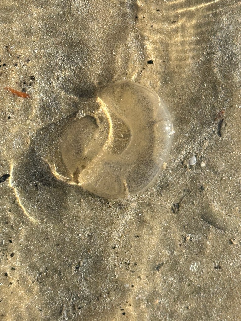 We found strange mounds of squiggly sand all over the beach and a couple of jelly fish. Rocks with barnacles and different types of seaweed were other finds as well as a collection of shells.