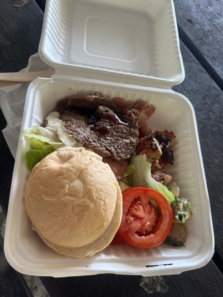 Our BBQ lunch was served right on time and we all wandered across to the marquee where a buffet had been set up. BBQ’d Steak, Bacon & Chicken with a variety of salads and a bread roll was our choices and our little group took ours up into the trees where there are tables set up so we could eat in the shade.