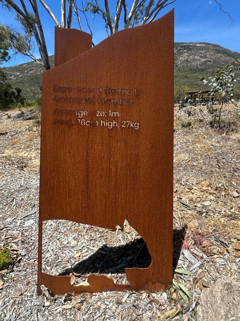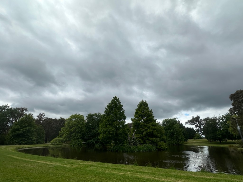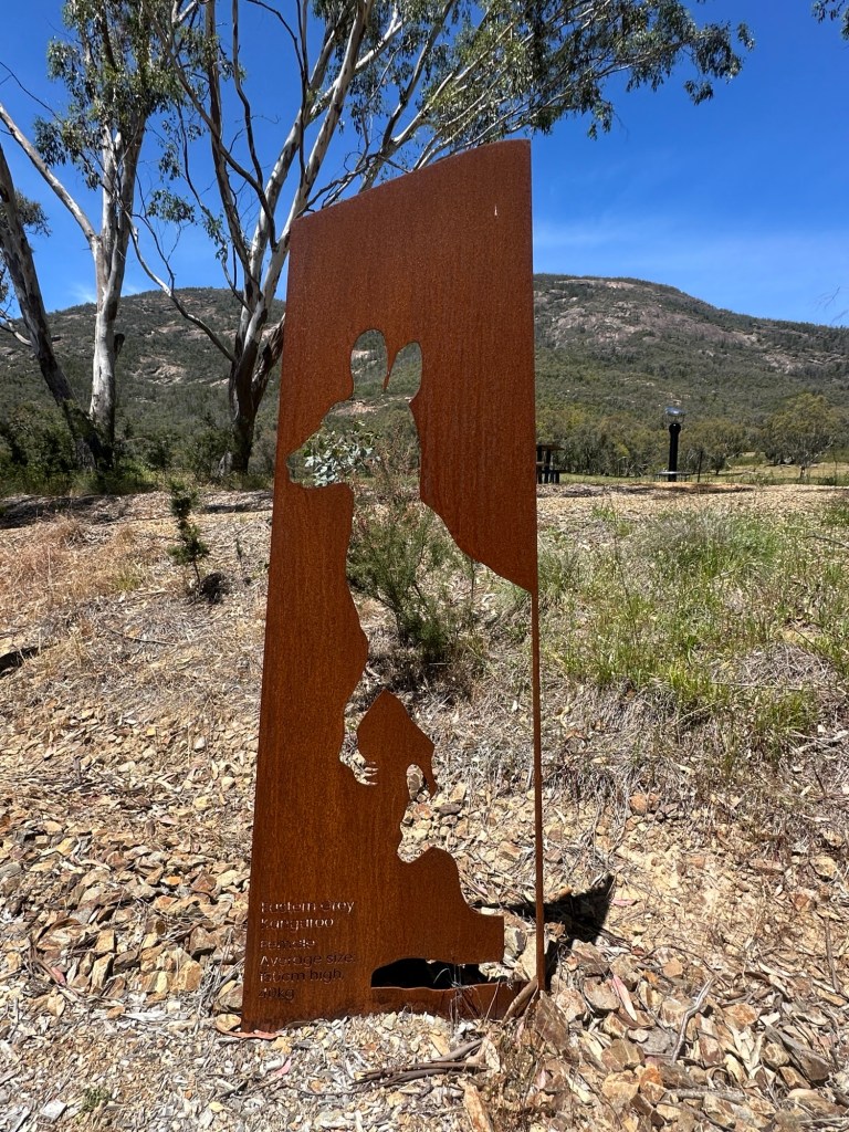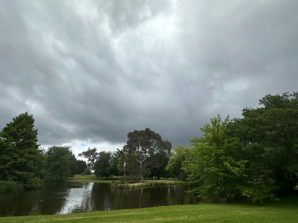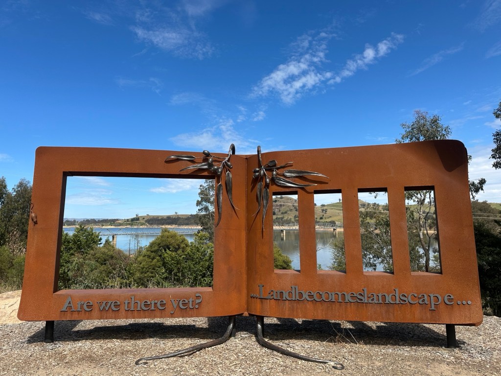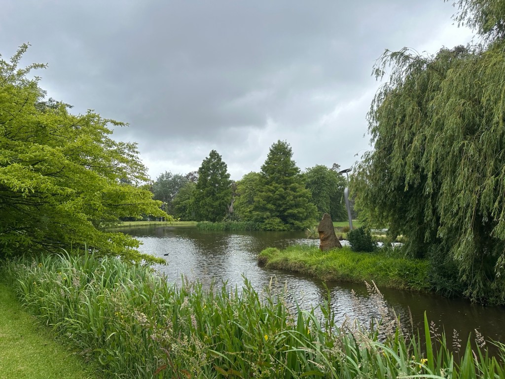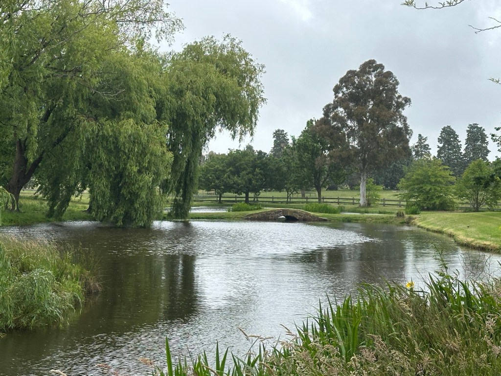 Continuing around The Cottage we came across a huge lake. The lake was constructed in 1987 to provide a sanctuary for birds. Dame Elisabeth was involved in all stages of the lakes development. Hundred of daffodils were planted behind the lake. Willow trees were planted and sadly they are almost at the end of their lifespan. Oaks and wattles were planted to complement the bulbs below. The lake has a couple of islands and a peninsula reached by a stone arched bridge. On the end of the peninsula stands a tall stainless steel ‘Ibis’ sculpture by the artist Phil Price. It has a large blade that moves in the wind and reminds you of an Ibis moving their long beak up and down. It was commissioned by the family for Dame Elisabeth’s 100th birthday and she loved it.