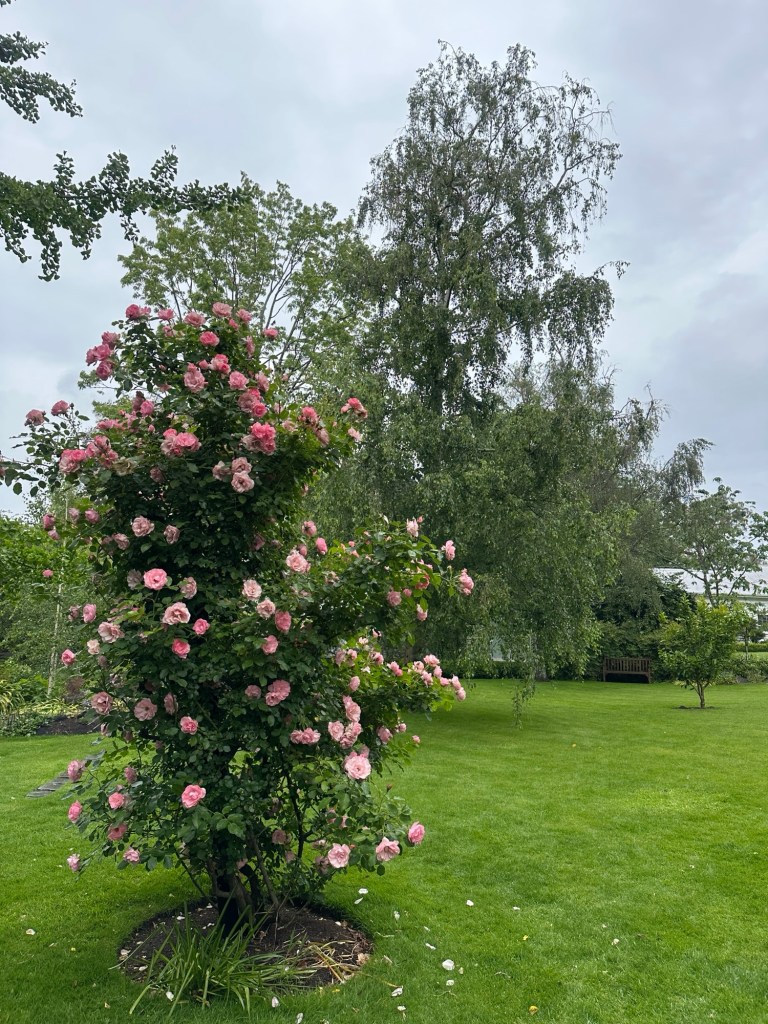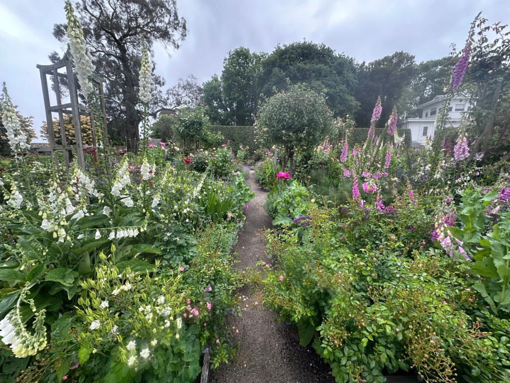 We continued our tour in a clockwise direction down past a delightful rose garden. Lewis explained that some of the roses are such old varieties that they have still not been able to identify some of them. The oval shaped rose garden is also full of perennial plants including spectacular tall foxgloves.