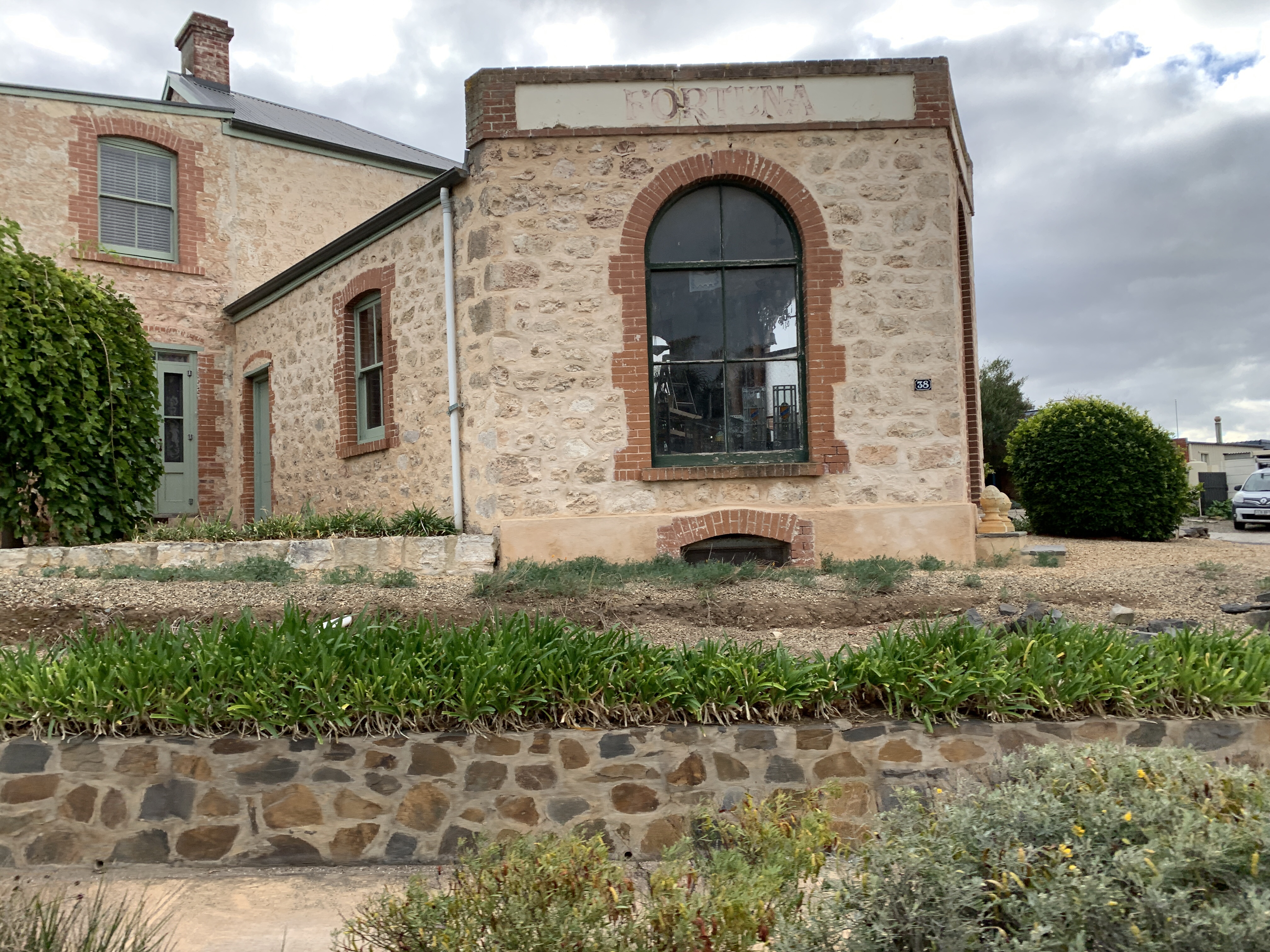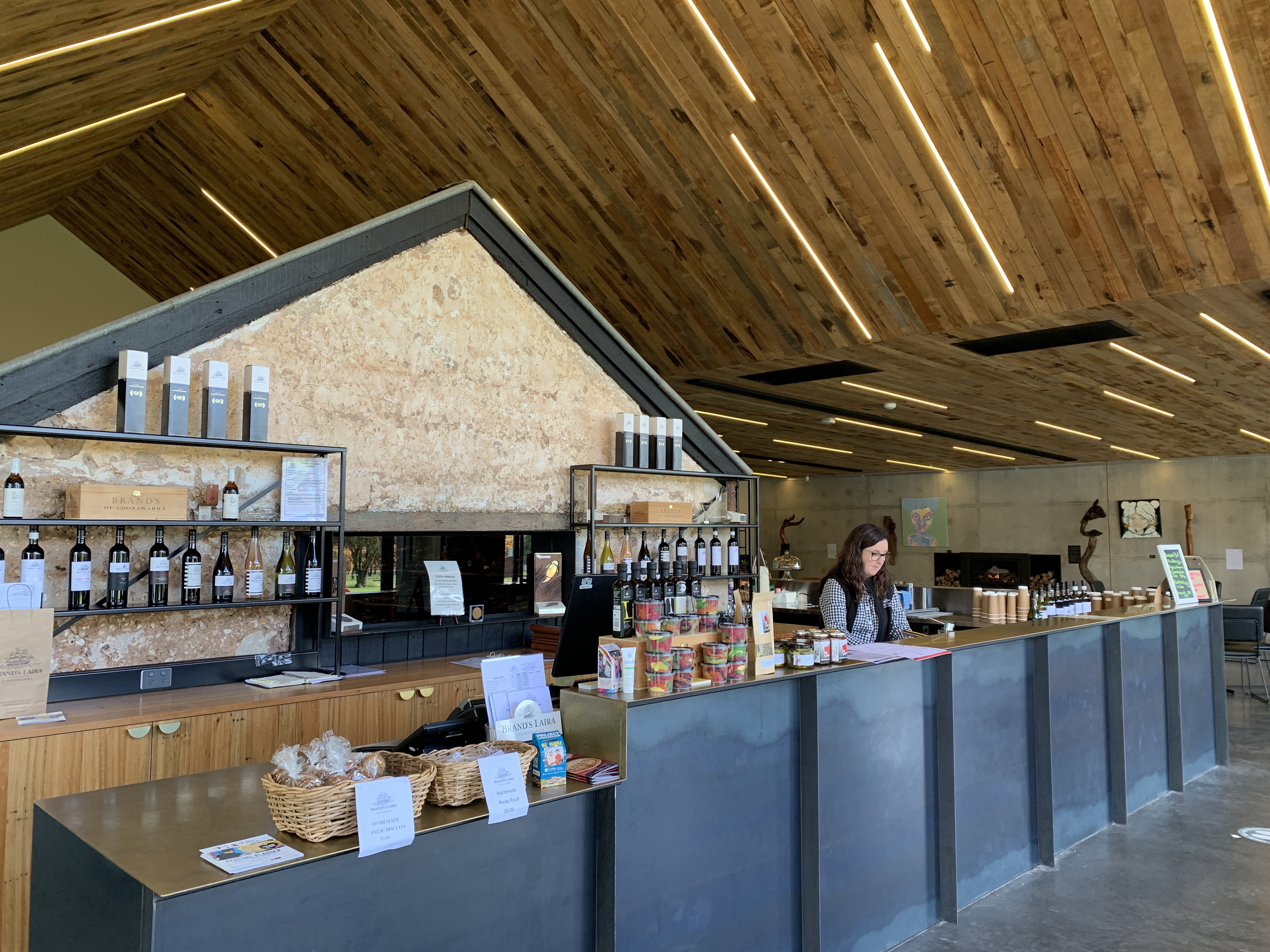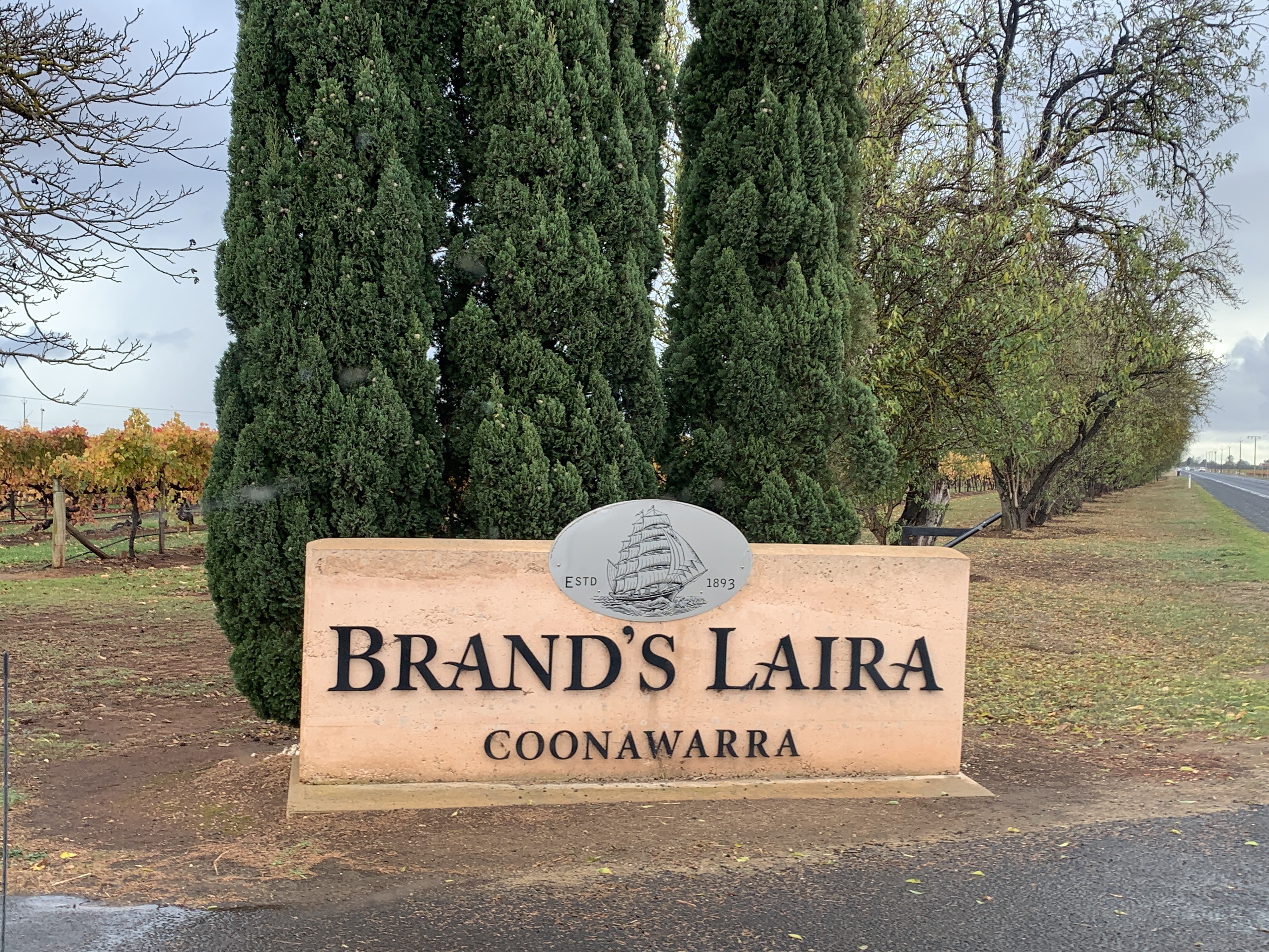 Our next stop along the Riddoch Highway was to one of Richard’s favourite wine labels Brands Laira. Brands Laira is an iconic winery in the Coonawarra and is now owned by the Casella Family Brands company from Griffith. The vineyards here date back to 1893. The recently constructed cellar door is fabulous with its polished concrete floors, rammed earth and concrete walls, Mountain Ash lined ceiling and fabulous bar made from steel with a brass sheet bench top. Inside the cellar door is the original Eric Brand’s cellar. This old building has been preserved inside the new one and its great to see this classic bit of history saved. The new cellar door has a lovely deck area that leads onto a lovely lawn with gorgeous roses that were still blooming. This would be a great spot for wine tasting and a Ploughmans Platter that you can preorder for $25 pp on a sunny day. Alas it was raining.