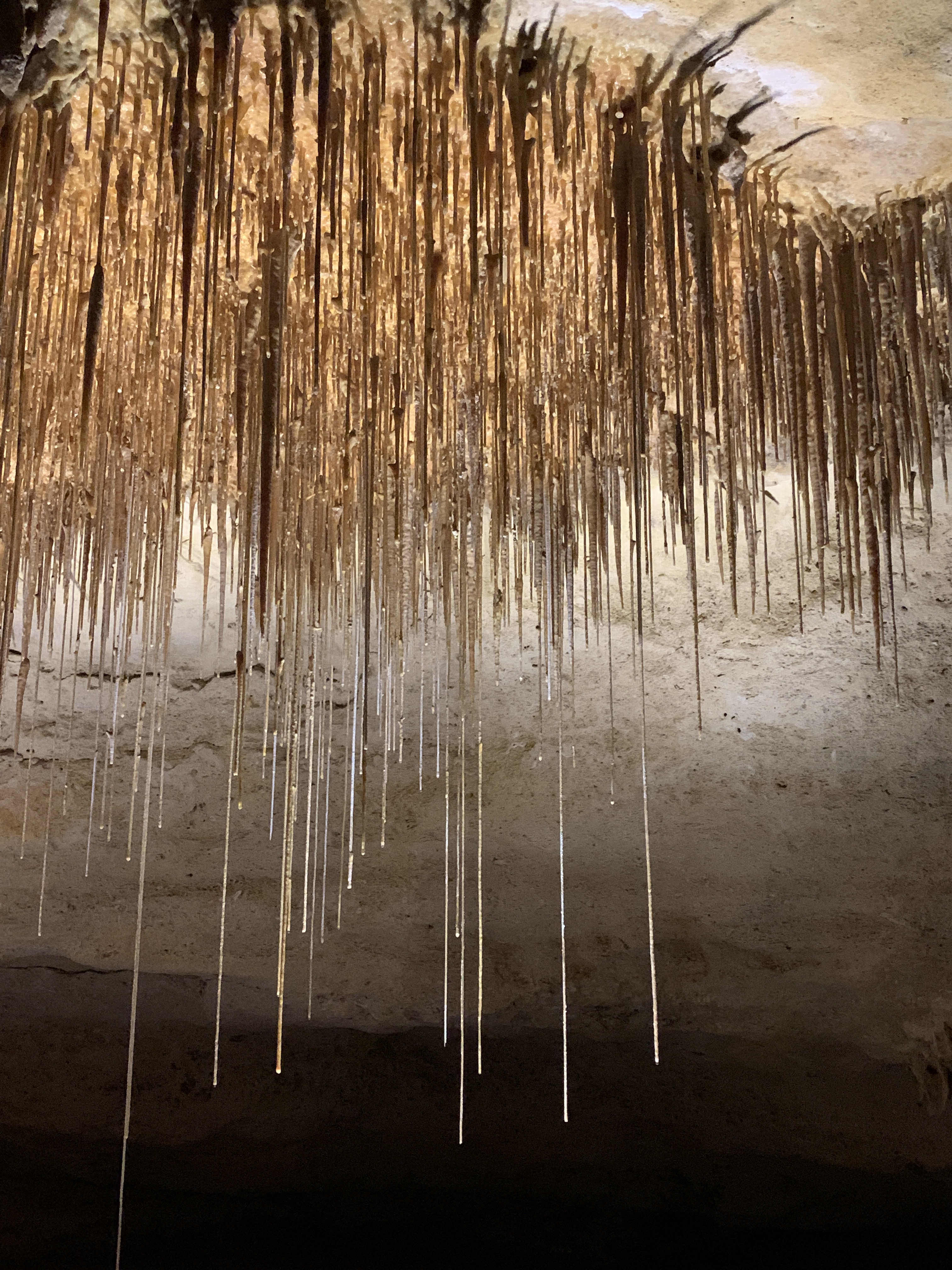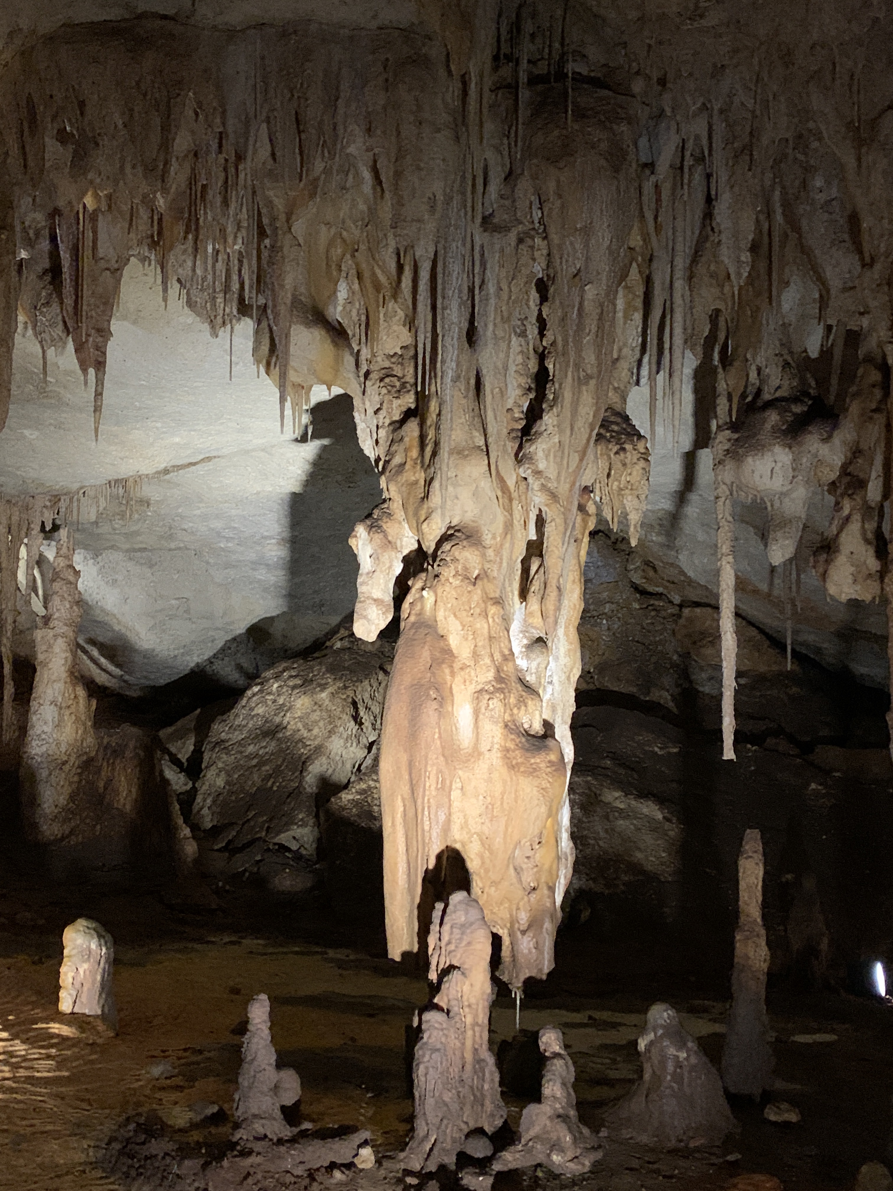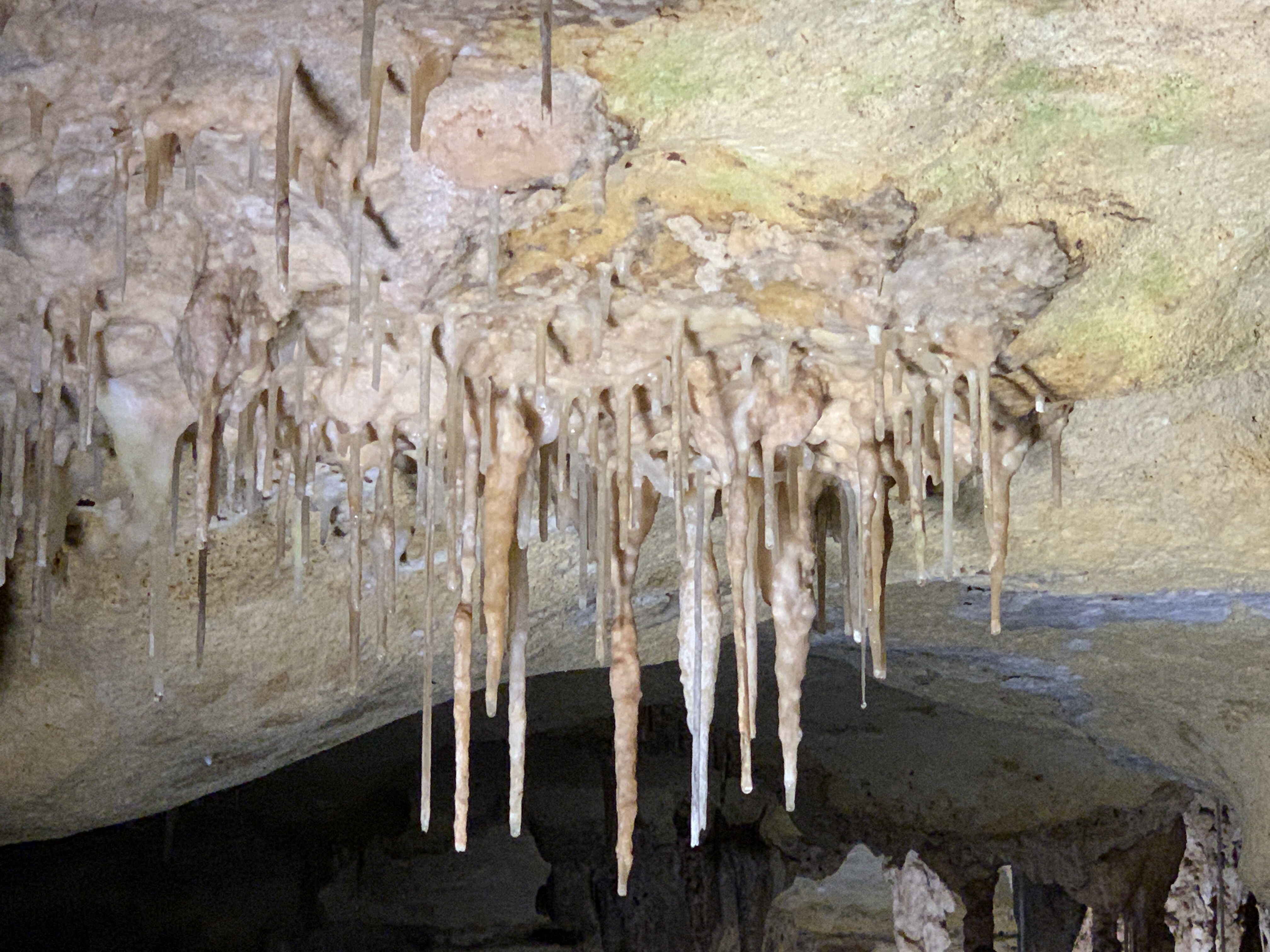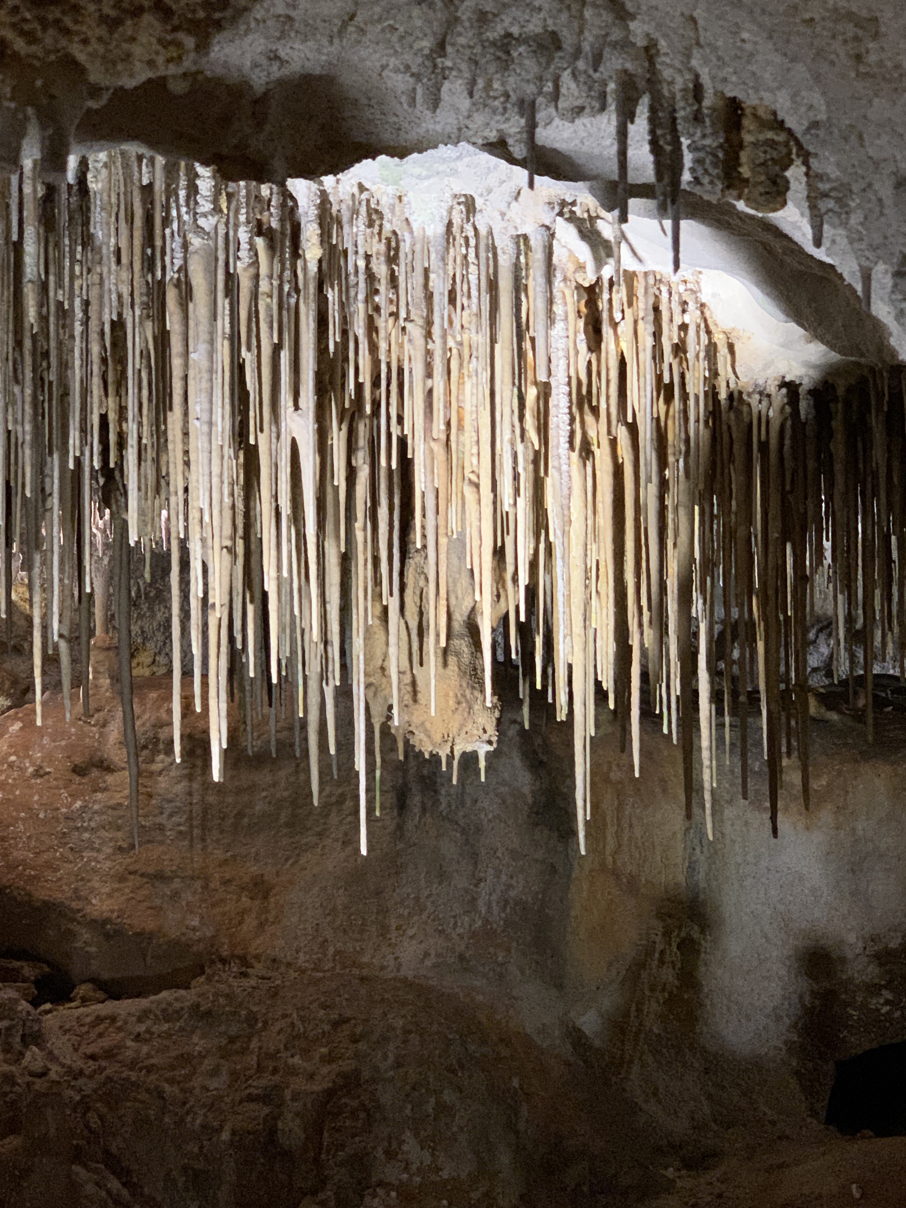We then did the self-guided tour of Stick-Tomato Cave. This cave is very different from Alexandra Cave as it is much drier. The formations in this cave are covered in a white chalky substance. The ones close to the large entrance are covered in green algae, a result of being in too much light. There was one really interesting formation on the ceiling of this cave called Avens. This is where the roof is formed into lots of hollows by the water dripping into the cave absorbing carbon dioxide and becoming acidic and it dissolves the limestone into these amazing shapes.
