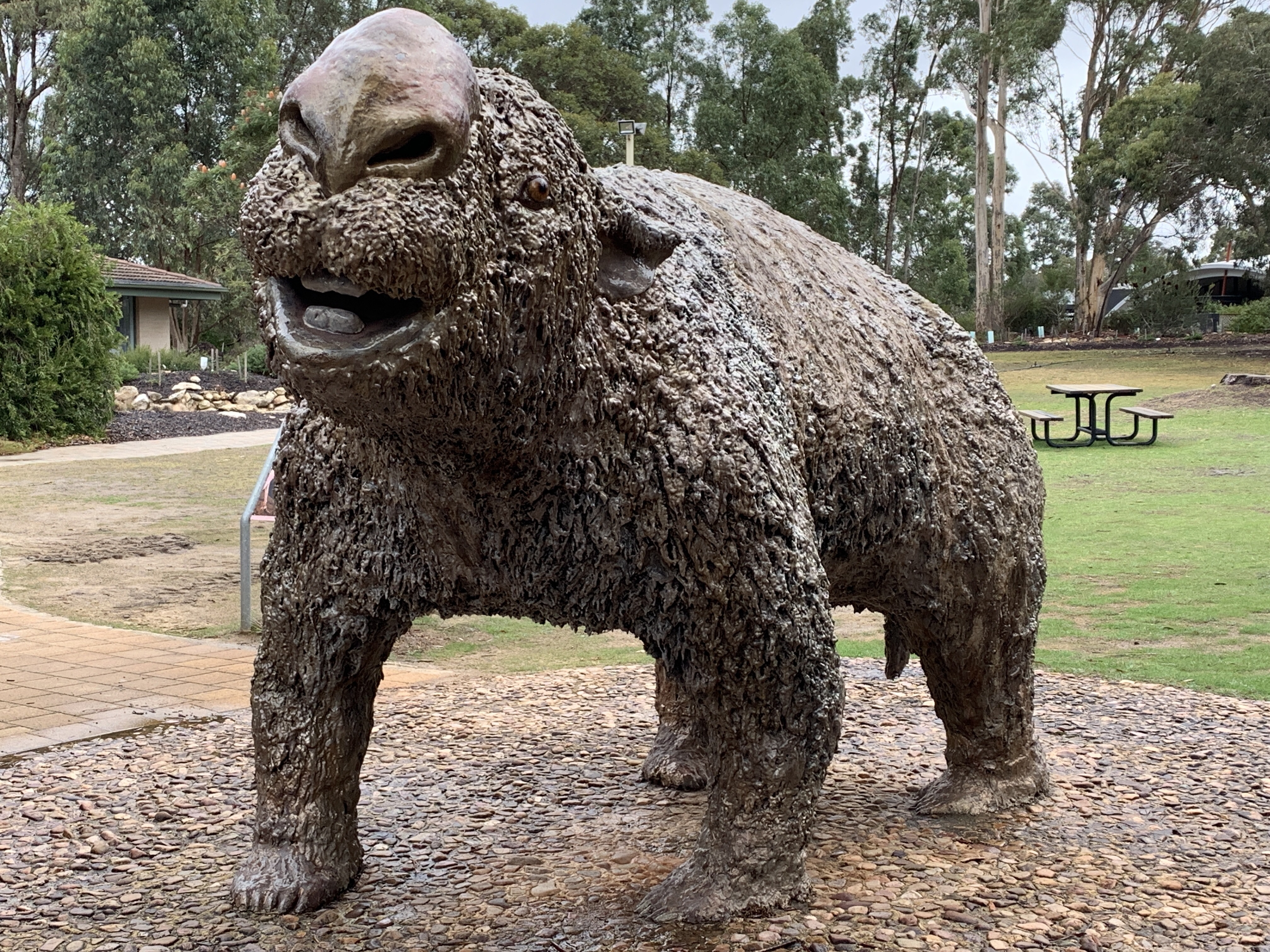 Inside is a re-creation of what the Naracoorte area may have looked like 200,000 years ago based on years of research by palaeontologists. They have been able to reconstruct skeletons of these extinct animals and work out what they looked like and what they ate. The life-sized animated models have been built as scientifically accurate as possible. This group of very large extinct creatures are know collectively as ‘megafauna’ and they roamed Australia alongside many of the animals we still have today. It is still not know why the megafauna disappeared but it was around 50,000 years ago and could be linked to the arrival of Aborigines. Aborigines may have hunted the slow moving megafauna or altered their habitats by burning. Or maybe it was climate change. Australia has experienced several ice ages over the last million years so maybe climate change wiped out the megafauna. Who knows?