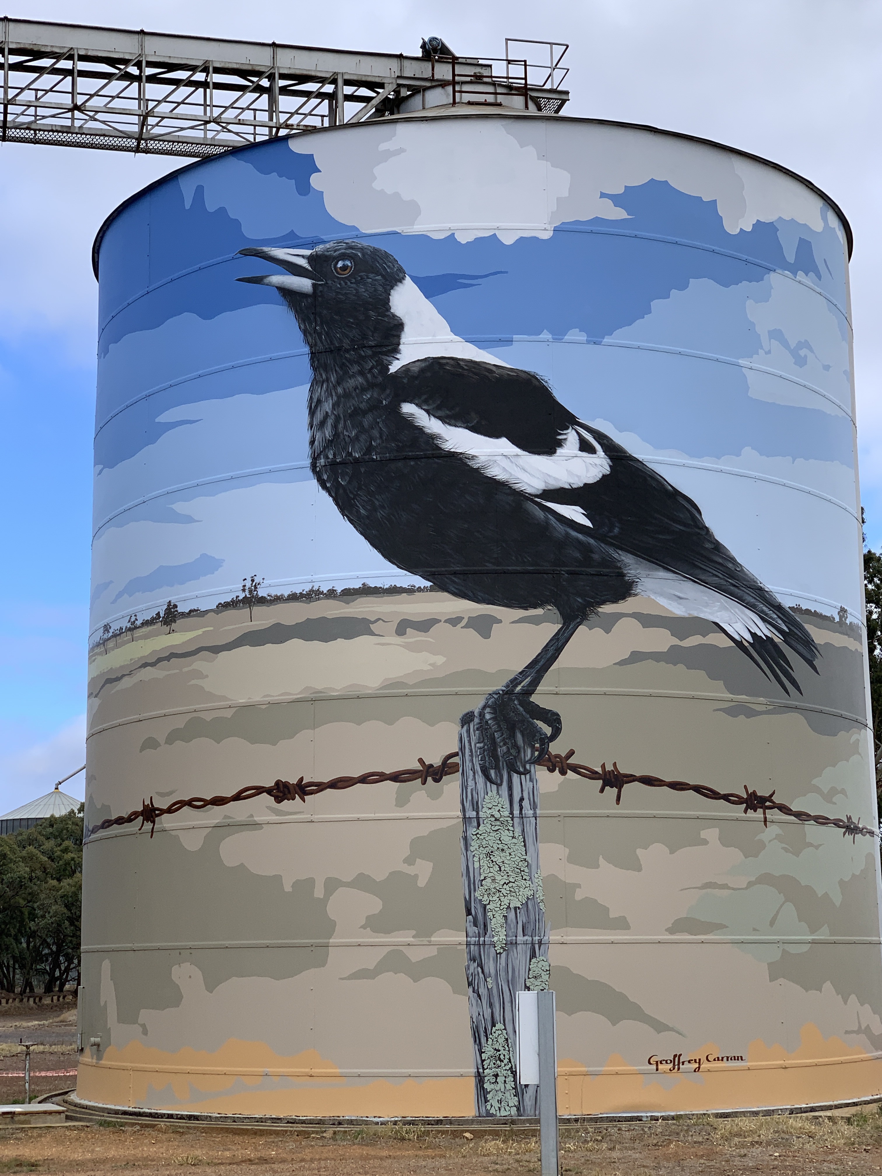 The first Silo Art we came across on the trip was the silos at the tiny community of Goroke on our way to Horsham. The artwork was painted by artist Geoffrey Carran and features a Kookaburra, a flying Galah and a Magpie sitting on a barbed wire fence. I particularly liked the barbed wire. It looked so real.