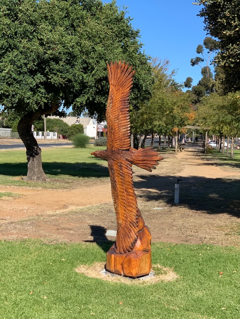 The Main Street of Rupanyup is a divided street with a park running down the middle. At various points in the park are six wooden sculptures by Gippsland chainsaw artist John Brady.