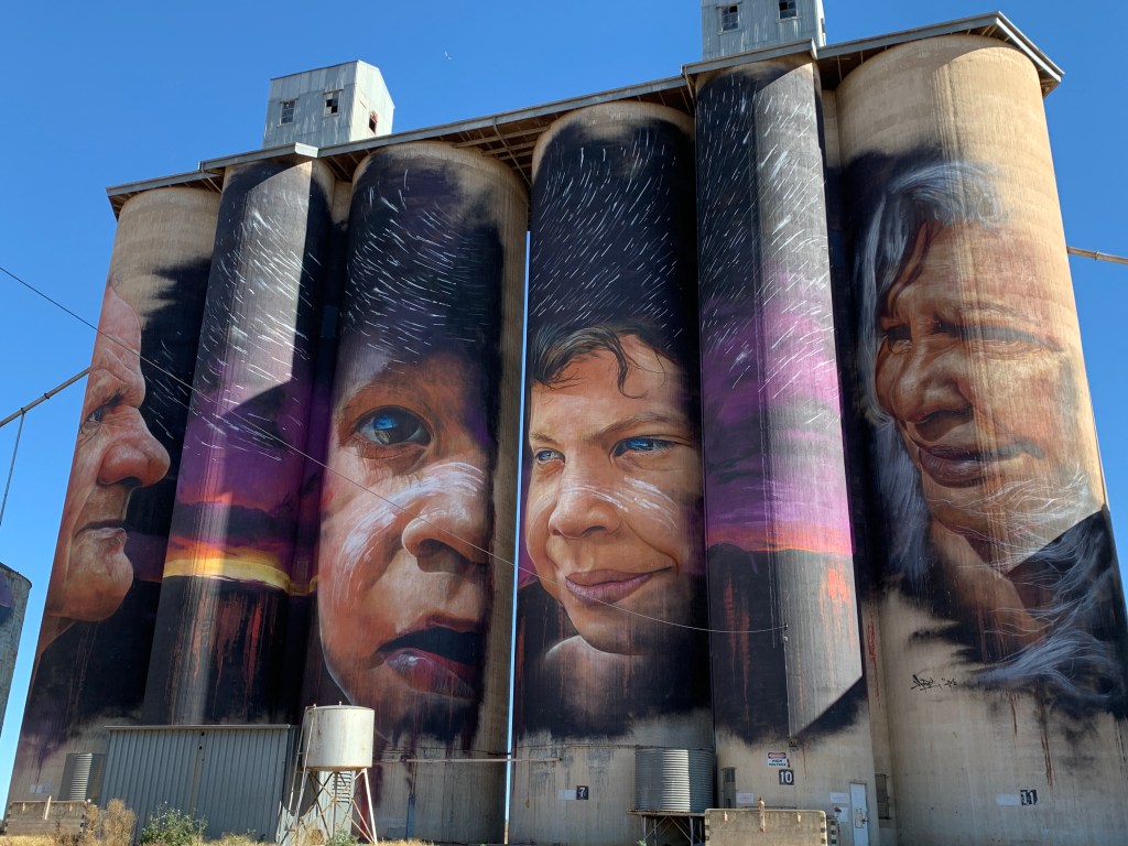 Next stop along the Silo Art Trail was the silos at Sheep Hills. This artwork is by Melbourne artist Adnate and he has used his work to tell the stories of indigenous people and their native lands. Adnate spent time in the community in 2016 and chose local Wergaia Elder, Uncle Ron Marks, and Wotjobaluk Elder, Aunty Regina Hood along with two children Savannah Marks and Curtly McDonald as the faces for this work. It is an amazing work.
