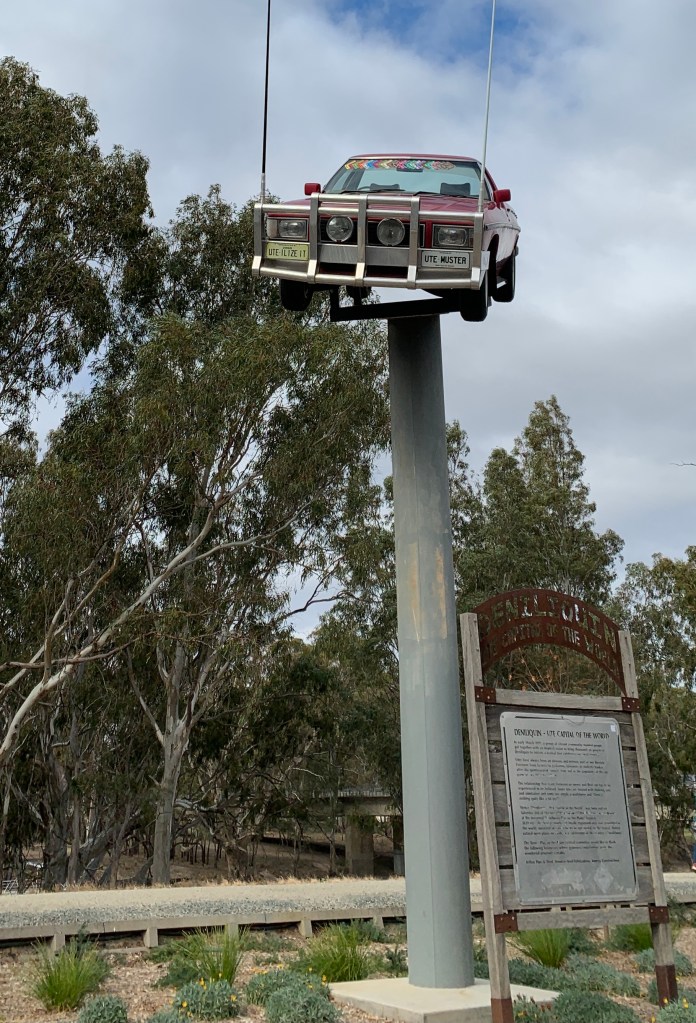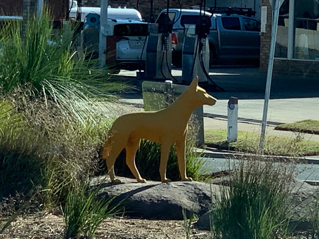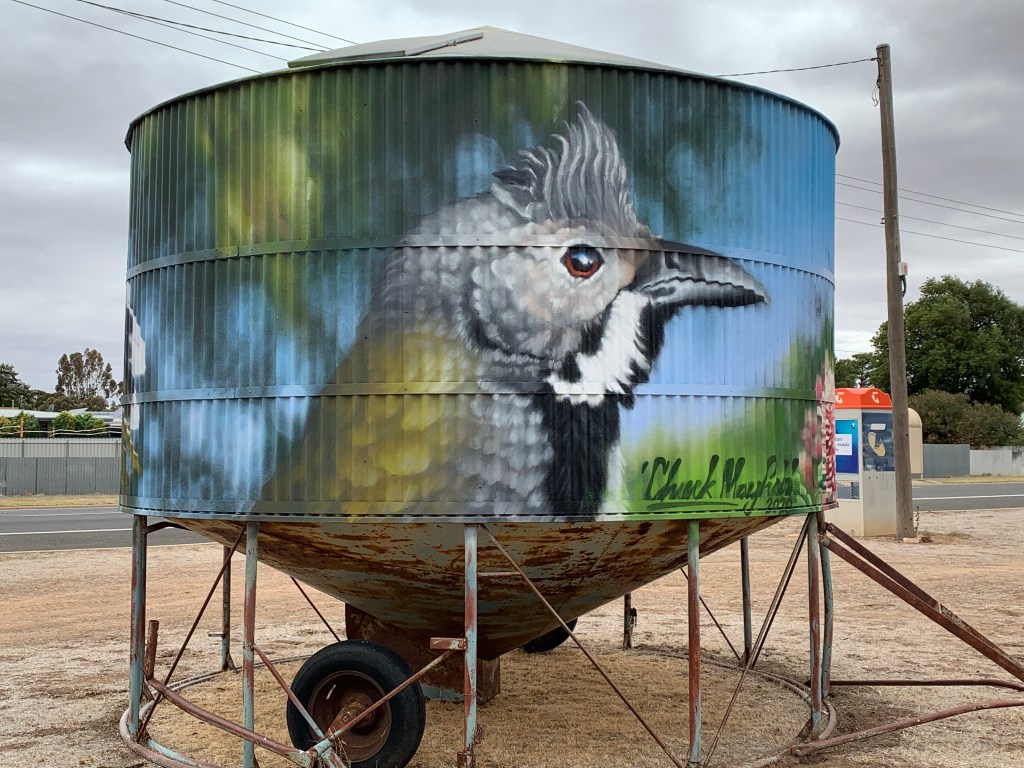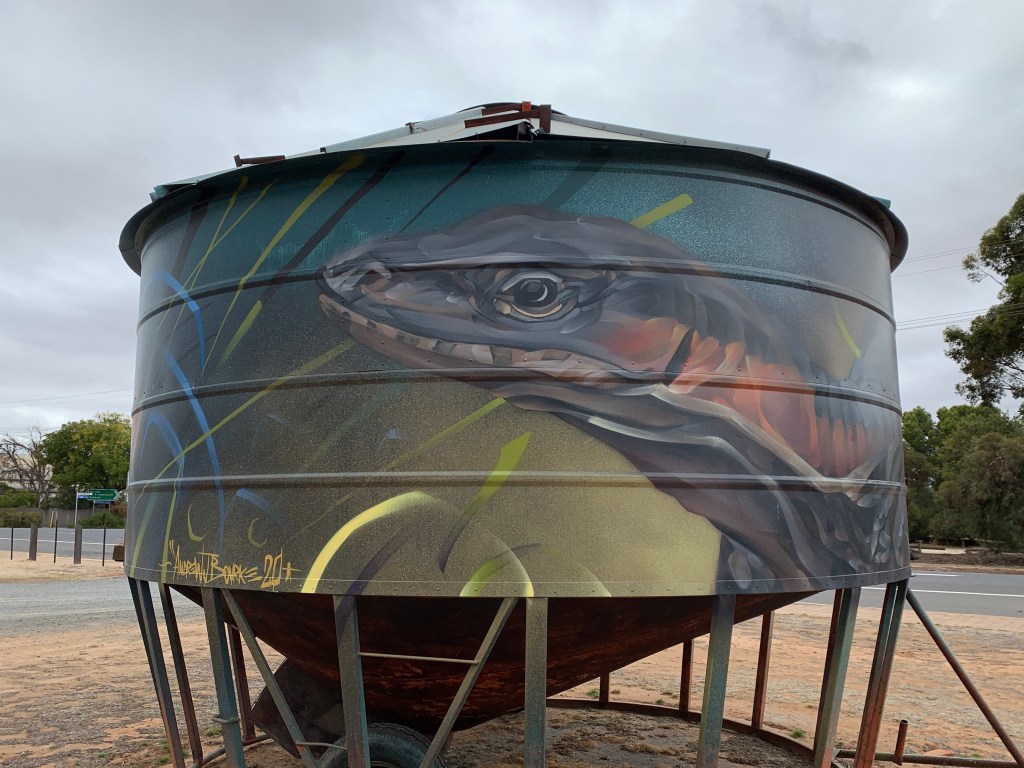 Jim & Chris had packed up and left before we got out of bed on Monday but we were up and heading out of the park about 9.00am and on our last leg towards home but not before we stopped to have a look at Deni’s painted water tower. Love this one with it’s Kookaburra.