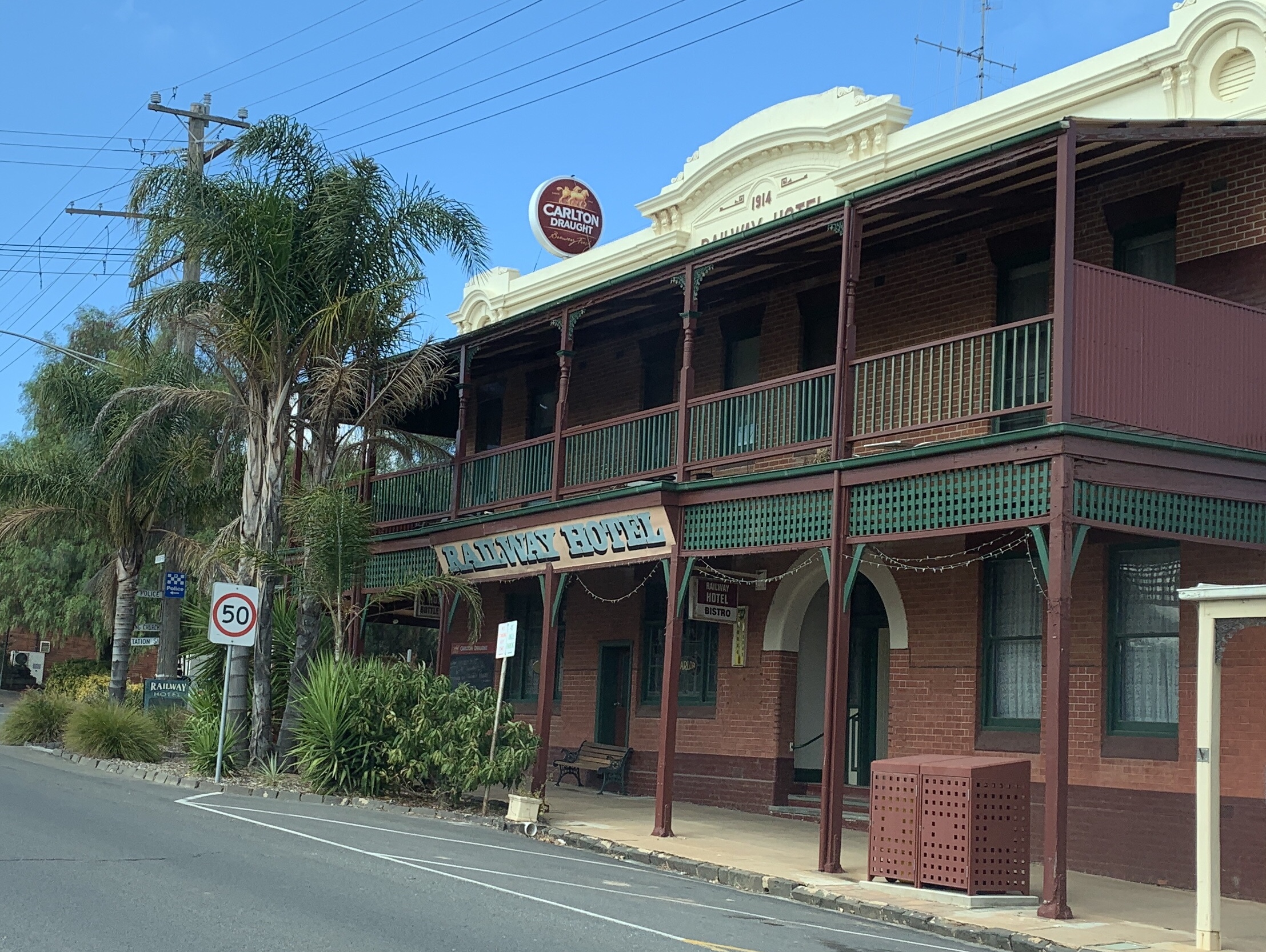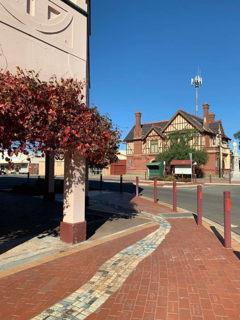 We arrived in Warrancknabeal at lunchtime. There are three street sculptures on the roundabouts in the Main Street. The first one you come across is a sheep dog, the second on the Federation Place Roundabout has a sheepdog and a group of sheep. On one corner of this roundabout is the incredible Tudor style Post Office built in 1861 and on the opposite is the historic Palace Hotel. On the footpath around theses buildings is an amazing mosaic set in brick paving stamped with local names and businesses that supported this redevelopment of the footpaths and roundabout. The third roundabout has a sculpture of a sheep dog sitting on some bags.