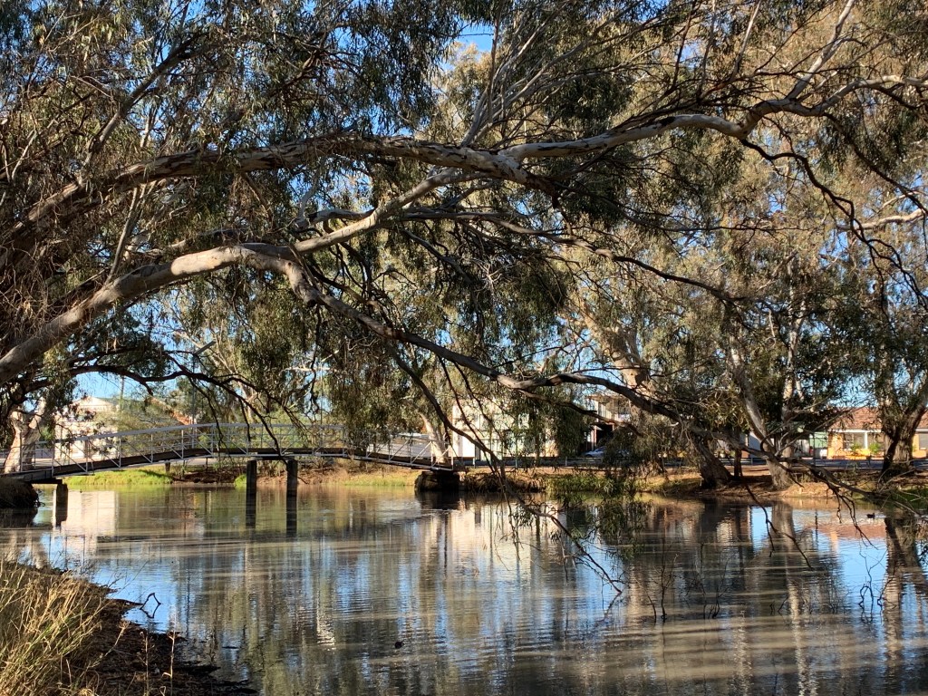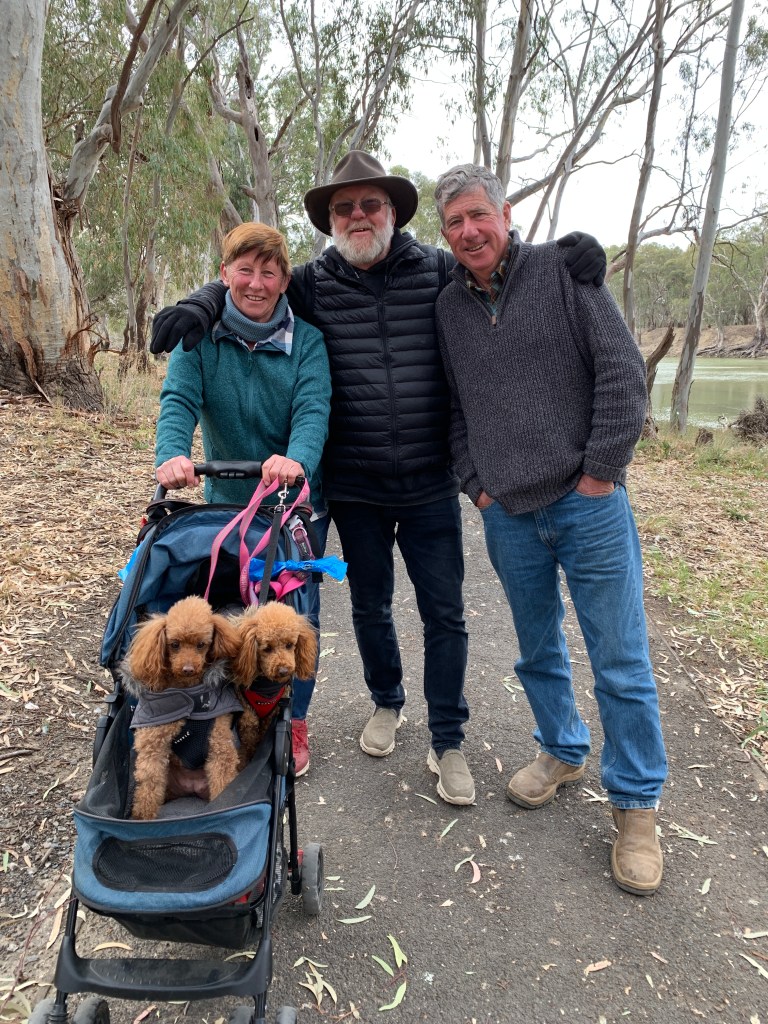 Sunday morning saw Kevin and Sally pack up and depart and head for home. Deniliquin has a lovely paved walk along the Edward River from McLean Beach to Willoughby’s Beach and the four of us (and the two toy poodles) decided to get a bit of exercise and follow the path. It was a lovely walk that took us along the riverbank, past the Ute on a Stick, under the bridge and onto the Island Sanctuary. This is a great place to spot native animals and birds. Once though the Sanctuary you pass the first town water supply tower and Memorial Park sporting grounds. You enter the Murray Valley Regional Park before finishing the walk at Willoughby’s Beach. Then we turned around and walked back along the riverside. We enjoyed another night around the fire pit.