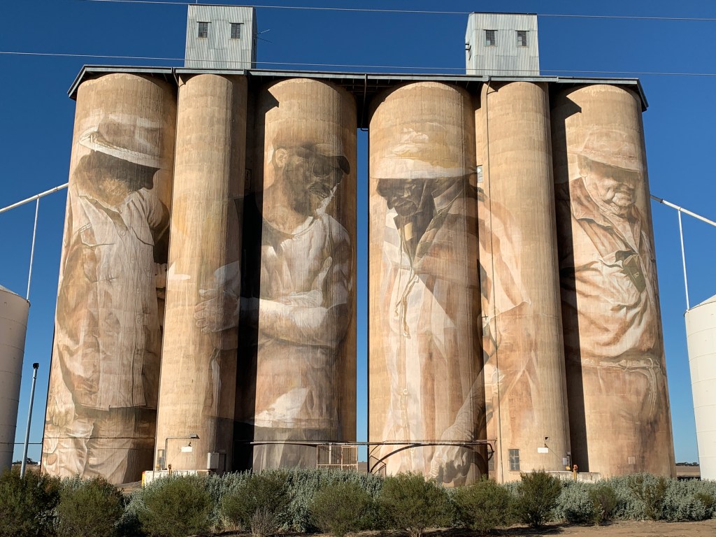 Patchewollock was our next stop. Artist Fintan Magee painted this work and he used local farmer Nick ‘Noodle’ Hulland as the subject. According to Magee, the lanky Hulland was just the right height and leanness to fit on the narrow 35 metre silo. This work was completed in 2016 and depicts the reserved Hulland as the typical Aussie farmer wearing a ‘flanny’, with a solemn expression, sun-bleached hair and squinting into the distance.
