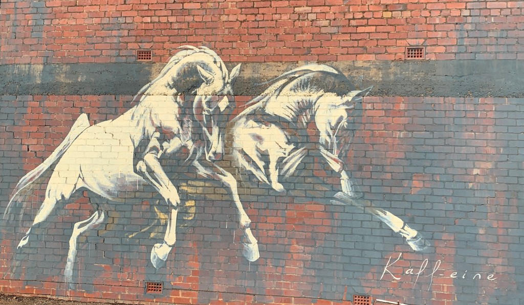 Further on in Beulah we found a street mural by artist Kaff-eine of two Arabian horses taking flight. Kaff-eine also painted the Silo Art at our next stop in Rosebery. This work was completed in 2017 and depicts a female farmer on the left and a horseman in his Akubra hat with his trusty horse on the right
