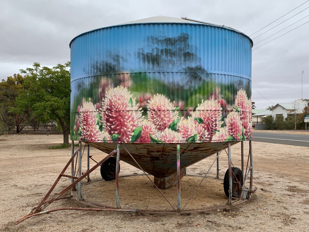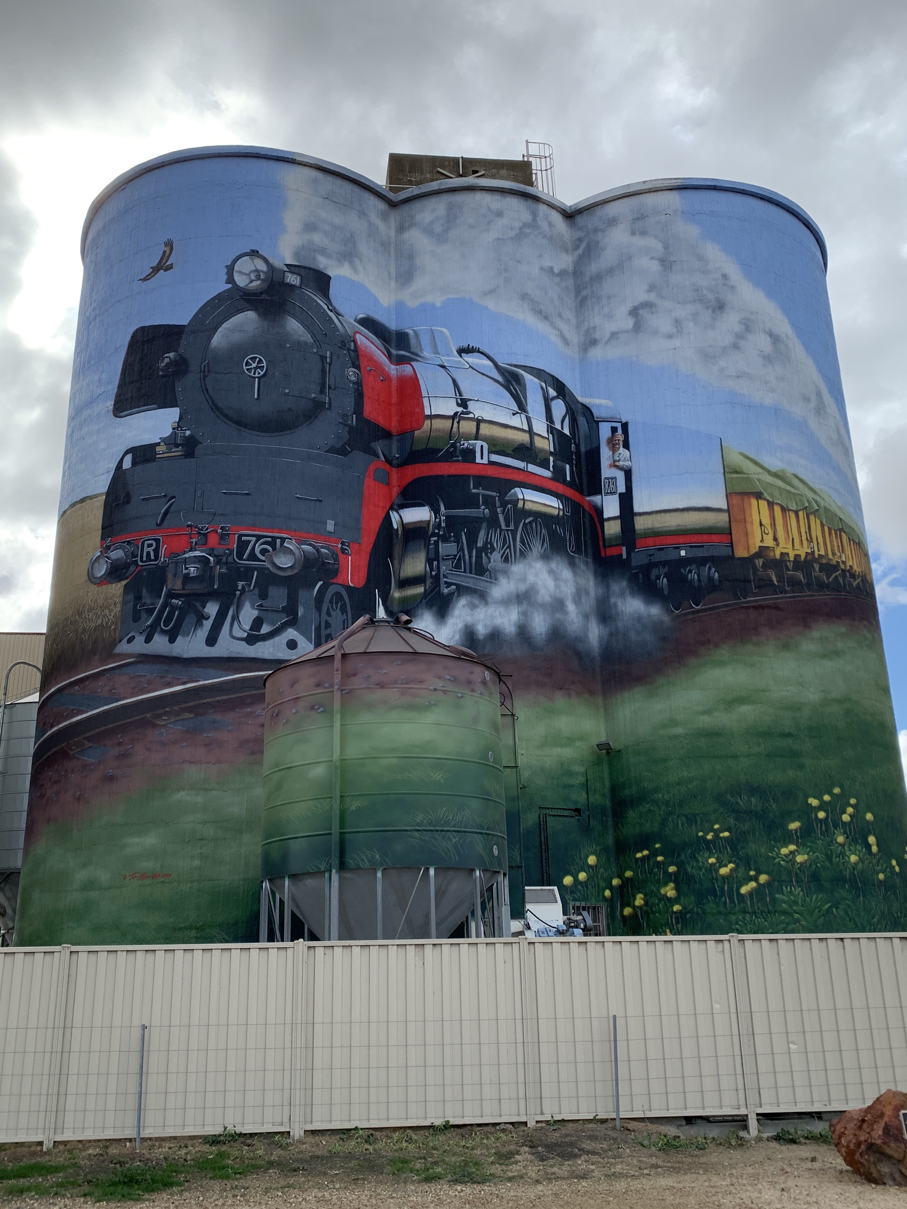 Next stop was the tiny community of Lascelles. Their Silo Art, painted in 2017, depicts a local couple whose families have been farming in the area for four generations. This work is by Melbourne artist Rone and he used local farming couple Geoff and Merrilyn Herman as the subjects of this work.