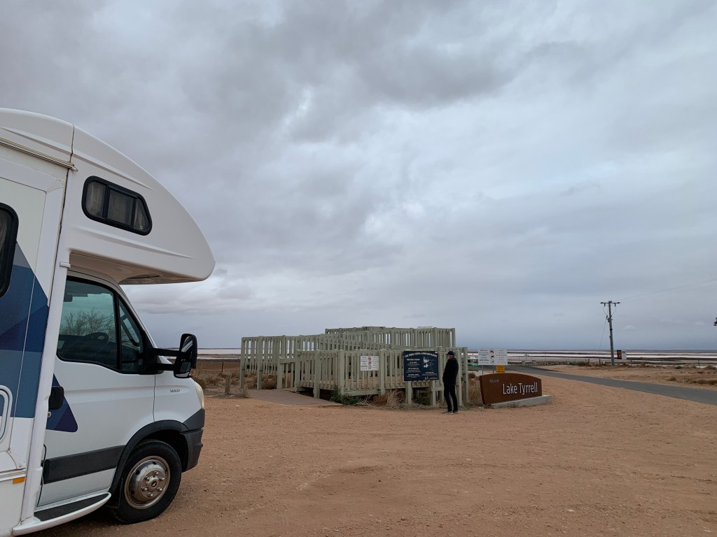 Next stop was at Lake Tyrrell near Sea Lake where we pulled in to have a quick look from the lookout. It had started to rain and was very cold so we didn’t stay long. Lake Tyrrell is a huge salt lake, the largest in Victoria at 20,860 acres. It is the terminal lake of the Avoca River/Tyrrell Creek system. Tyrrell Creek flows every 3-5 years but the water does not always reach the lake. There are signs of Aborignal occupation in this area and over 137 cultural sites have been identified. 100,000 tonnes of salt is harvested from Lake Tyrrell and you can see stacks of salt in the distance from the Lookout.