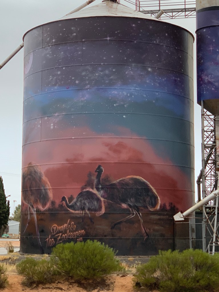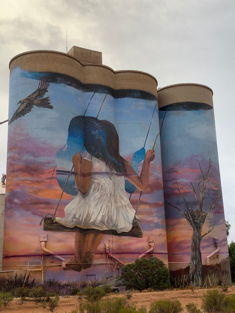 Our last silo art for the day was at Sea Lake where they have an amazing artwork by Drapl and The Zookeeper. This work depicts a young girl swinging from a Mallee Eucalyptus looking over Lake Tryell and reflects her indigenous heritage. It also depicts local flora and fauna around the lake.
