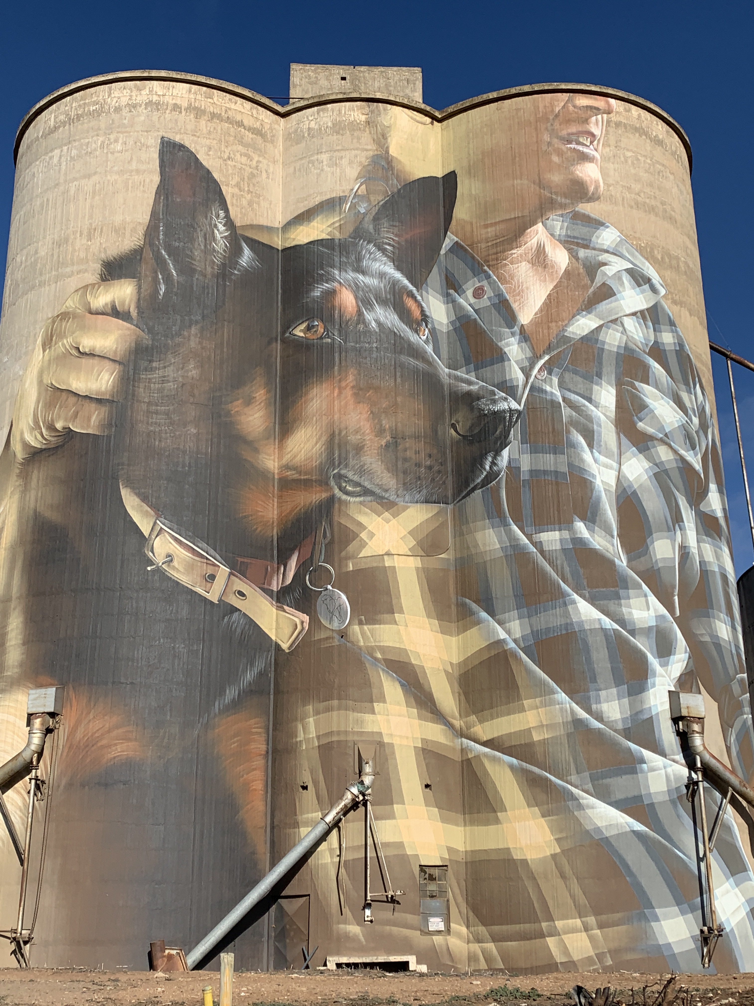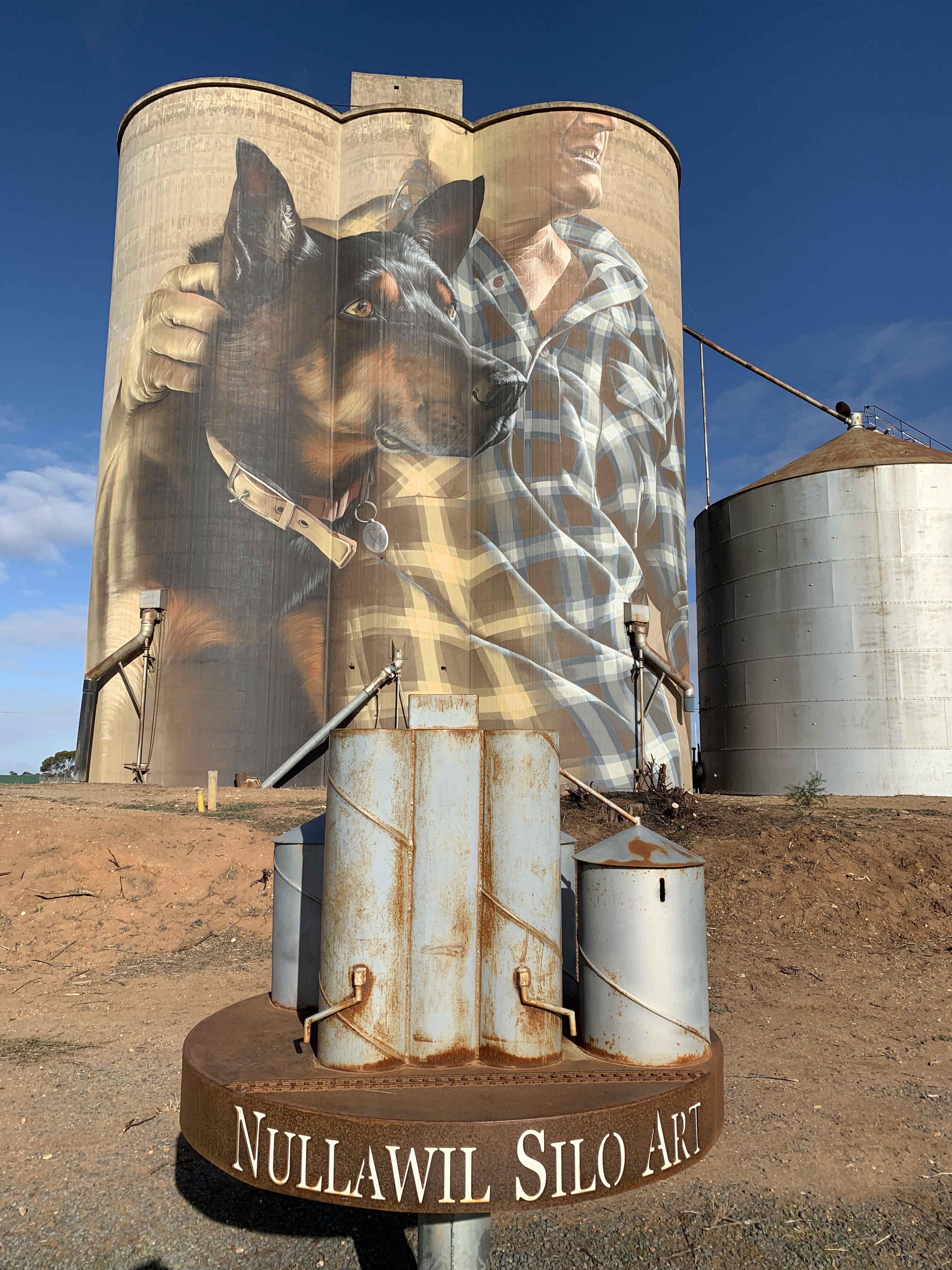 After leaving our overnight campsite at Green Lake Recreation Park we headed to the next silo art on the trail at Nullawil. Sam Bates was the artist commissioned to paint the silo at Nullawil and only took 14 days to paint the man with his dog.