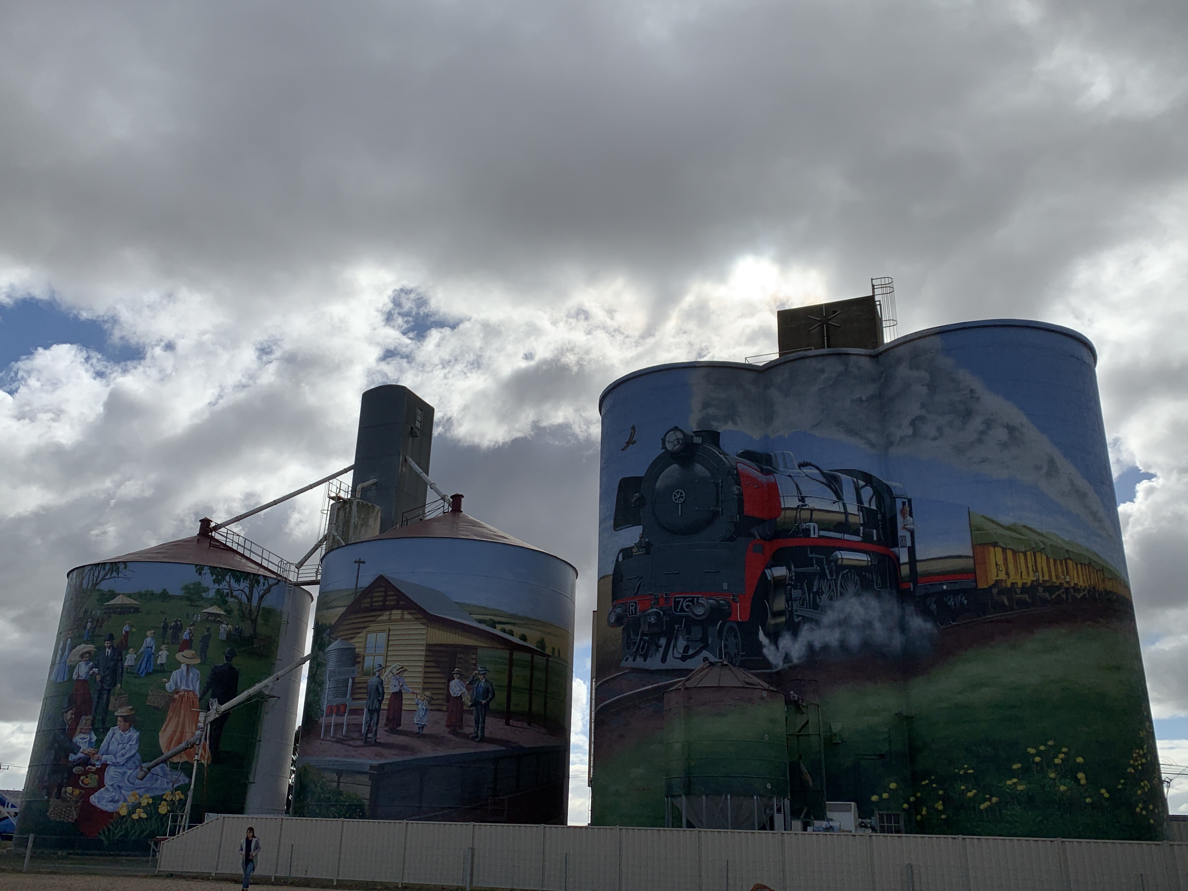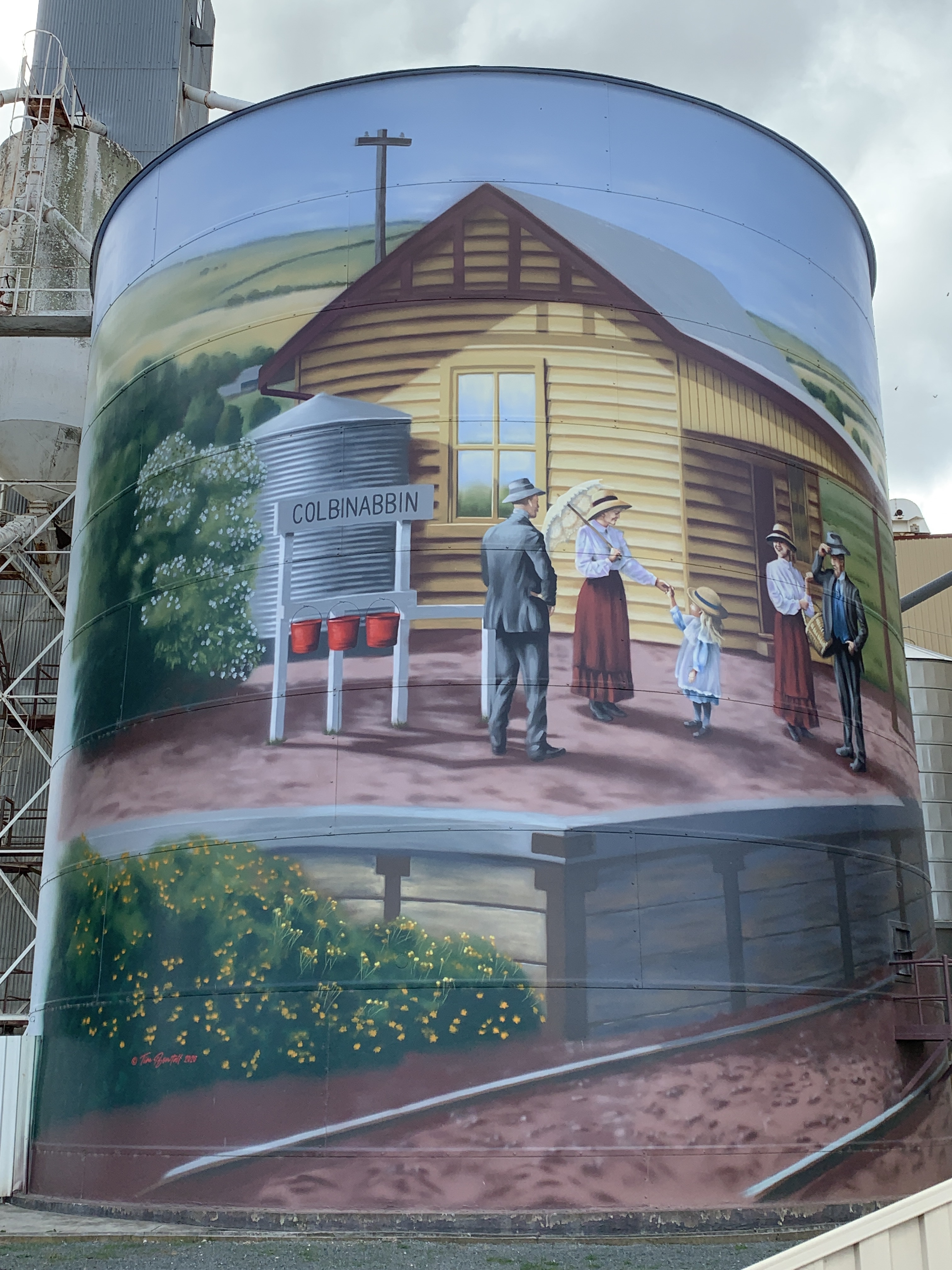 We travelled along back roads until we reached the small town of Colbinabbin. Wow their silo art is amazing. They have a large concrete conjoined silo in the middle and two metal silos on either side. Artist Tim Bowtell has painted them with scenes that reflect the area.