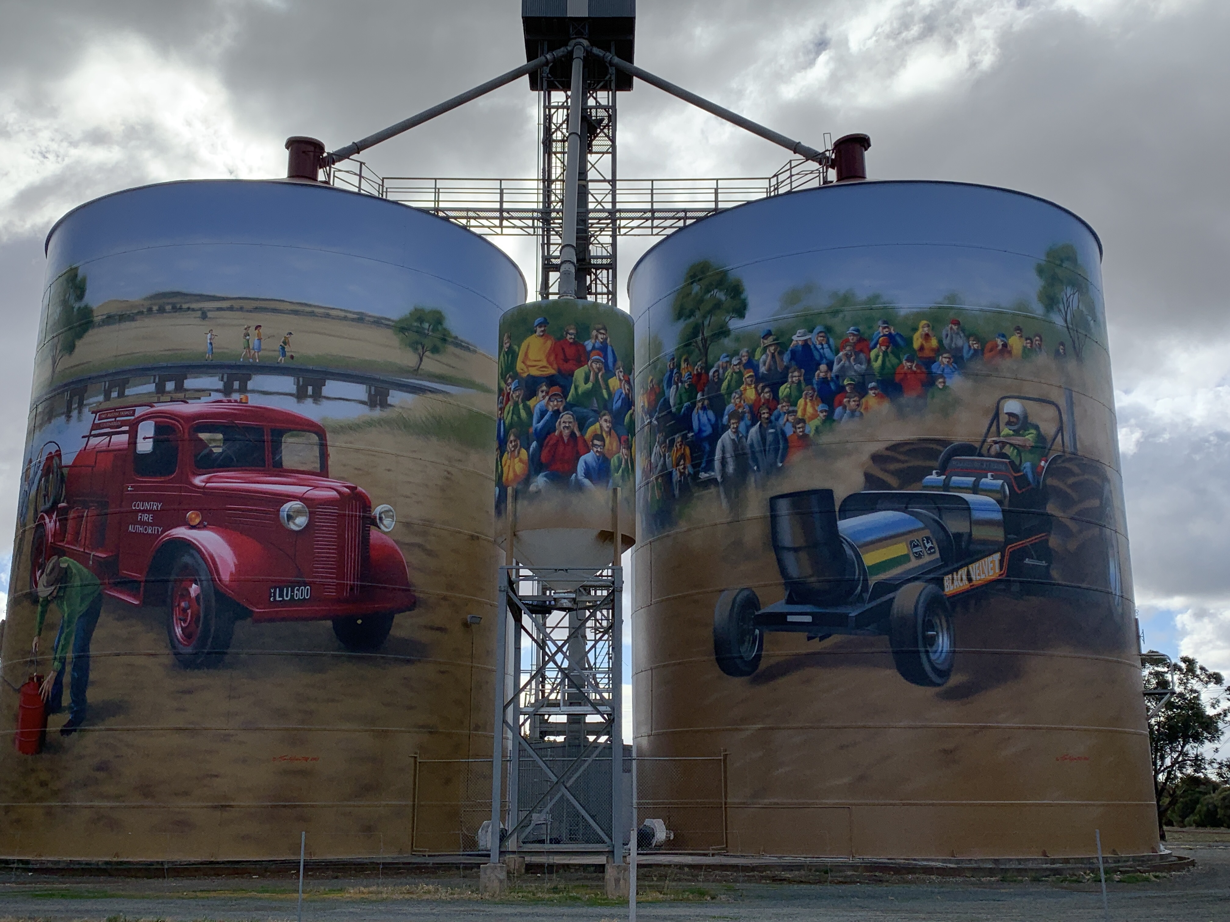 On the leftmost silo is a scene from the Colbinabbin Farmers Picnic, an annual event started in 1878 and ran for sixty years.