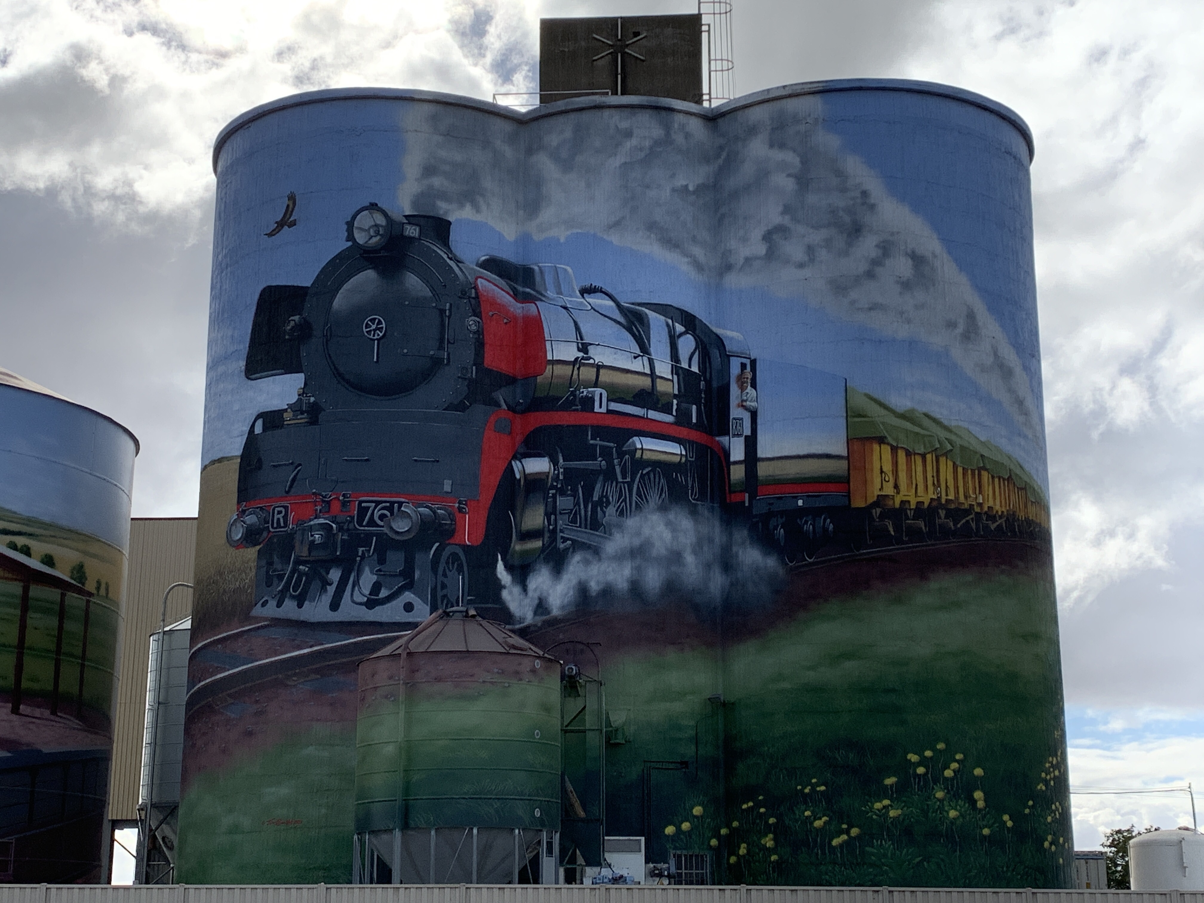 Next it was on to the next town on the Silo Art Trail, Rupanyup. Rupanyup’s silo art work was painted by Russian mural artist, Julia Vochkova. Her work features two local residents, Ebony Baker in her netball uniform and Jordan Weidermann wearing his Aussie Rules uniform. The artist wanted to show the youthful spirit of strength, hope and camaraderie by honouring the role that sport plays in rural communities. This pair of conjoined silos was painted in 2017.