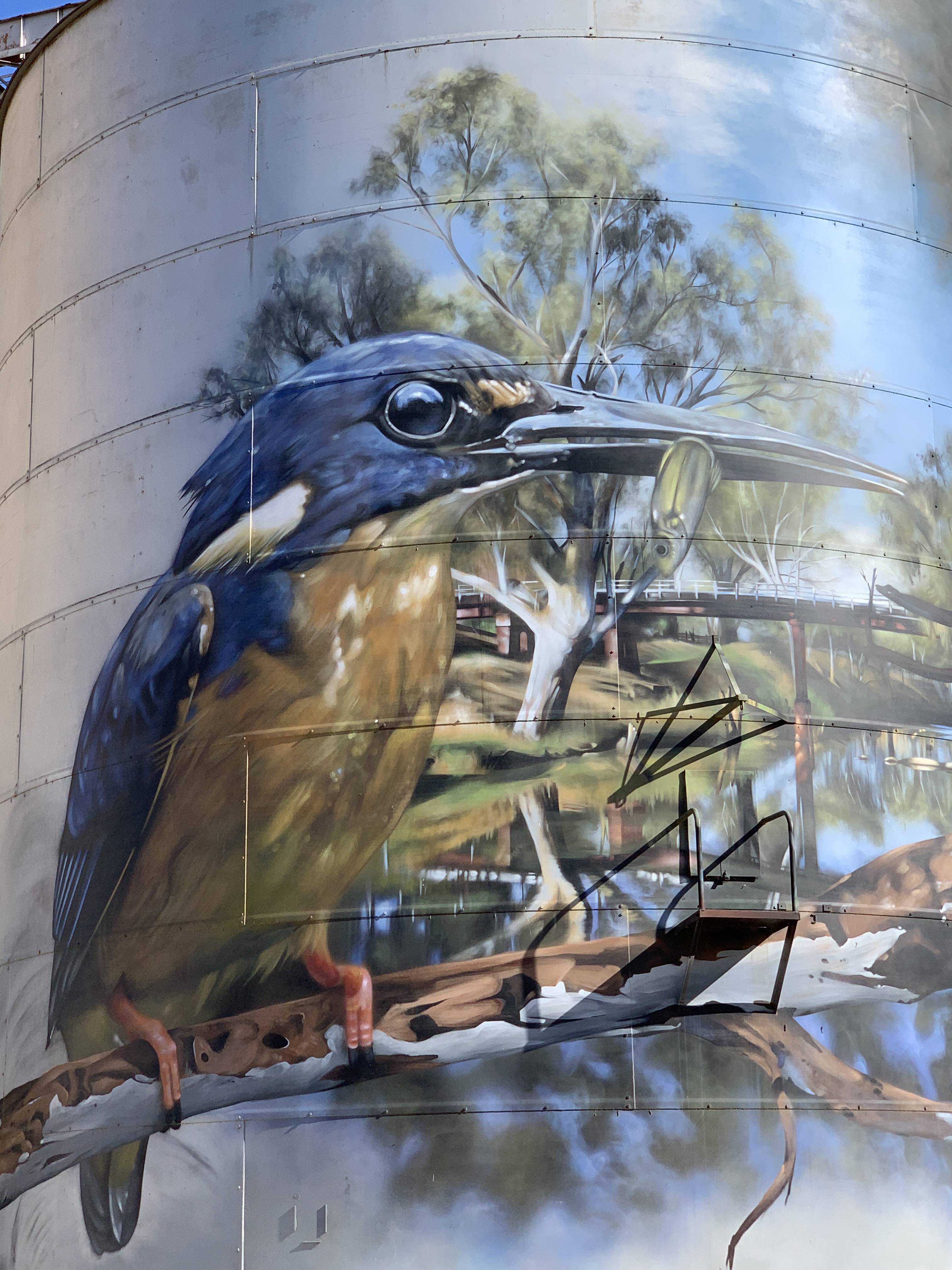 We continued on northwards to Rochester and our final silo art for this trip. The two silos at Rochester were painted by artist Dvate and depict an Azure Kingfisher and a Squirrel Glider.