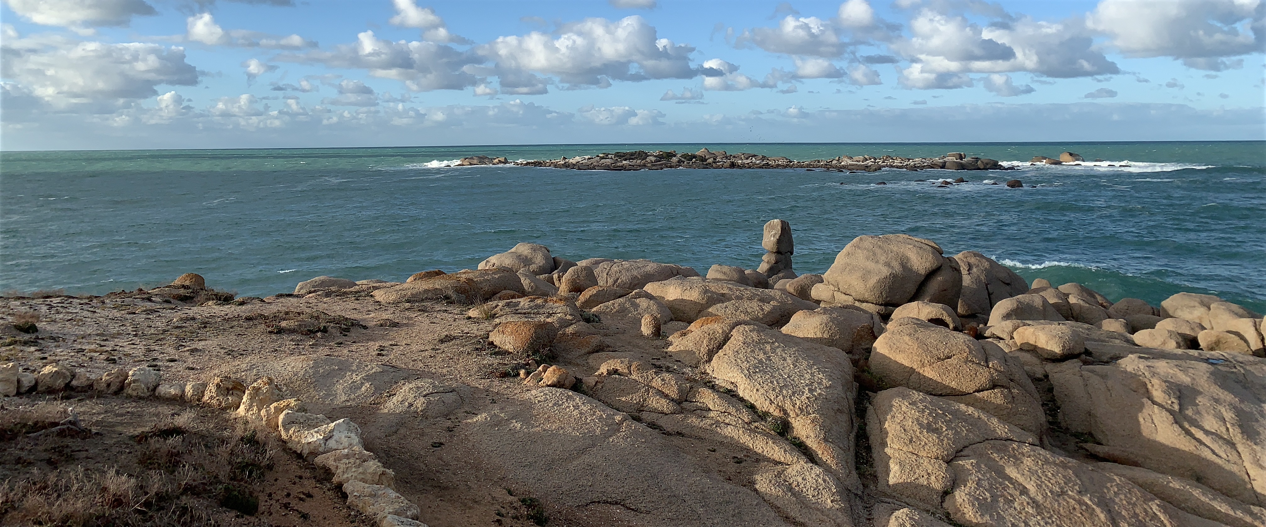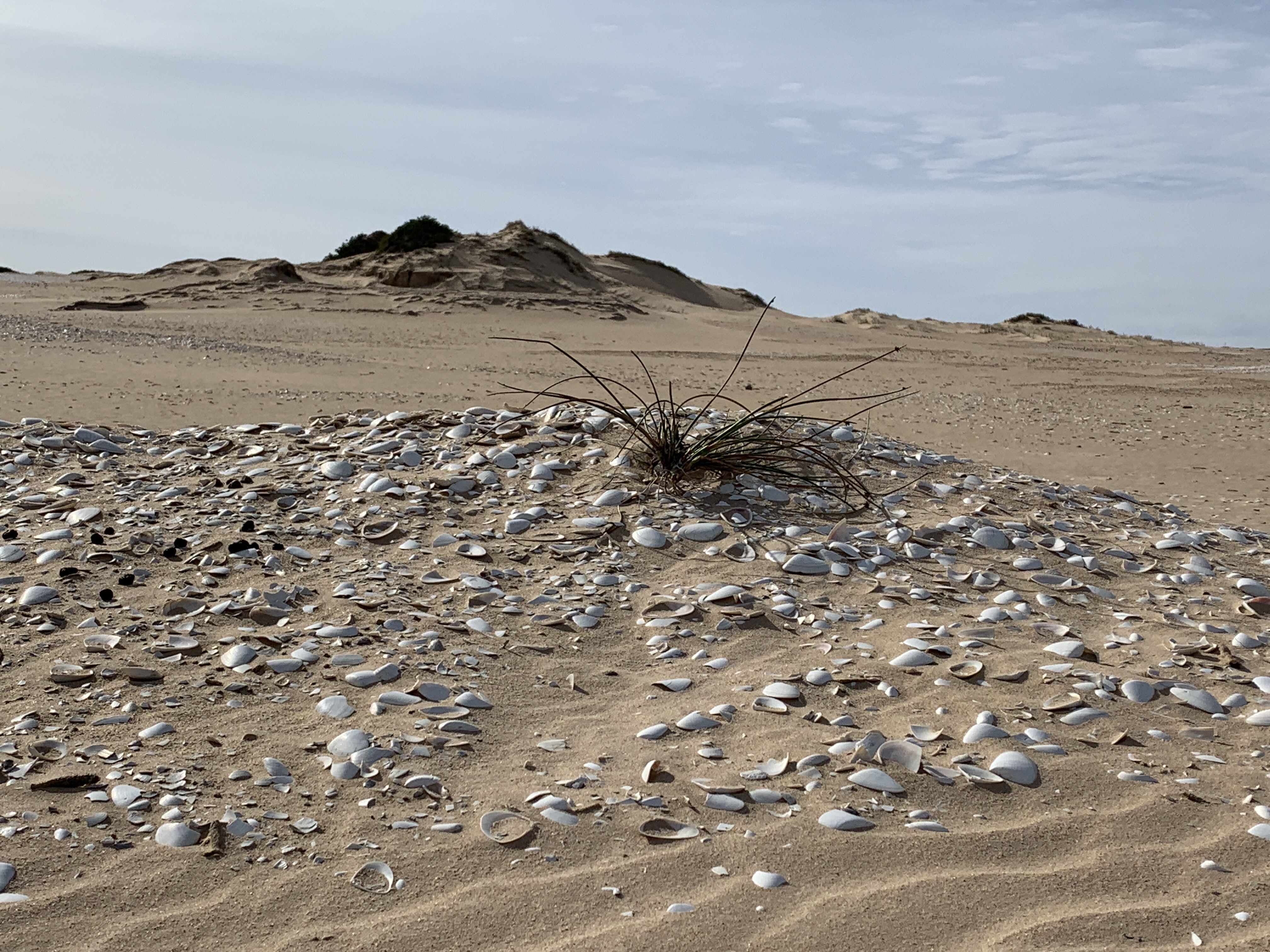 Our next stop was at Cattle Point where our guide this time was Skipper Rupert. We crossed the very high sand dunes and came to a huge wide area covered in broken shells. It is an Ngarrindjeri midden site and has obviously been used by them for thousands of years. We found blackened rocks that are not local to the area and these would have been traded for by the Ngarrindjeri to use for their fires. They were particularly good at basket weaving and would probably have traded baskets for these rocks. The local rocks are no good for fires as they just disintegrate.