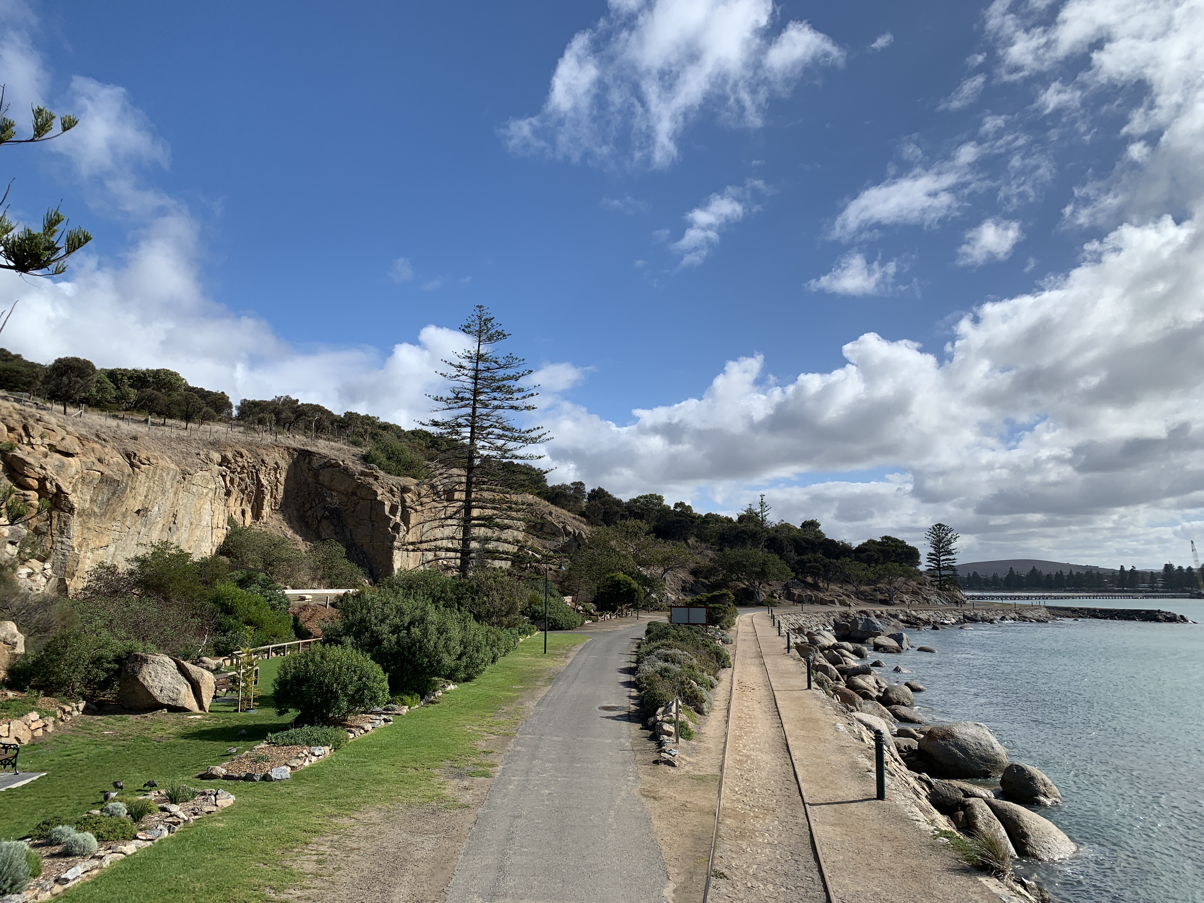 Only a few kilometres further along the coast is the historic Victor Harbor. Another beachside town with spectacular beaches. A highlight of a visit to ‘Victor’ is a ride on the Granite Island Tram. This is a horse drawn tram that takes passengers across the timber causeway to Granite Island. A Clydesdale horse pulls the historic tram and we thoroughly enjoyed our ride. We sat up the top in the sunshine and listened to those huge feet clopping along.