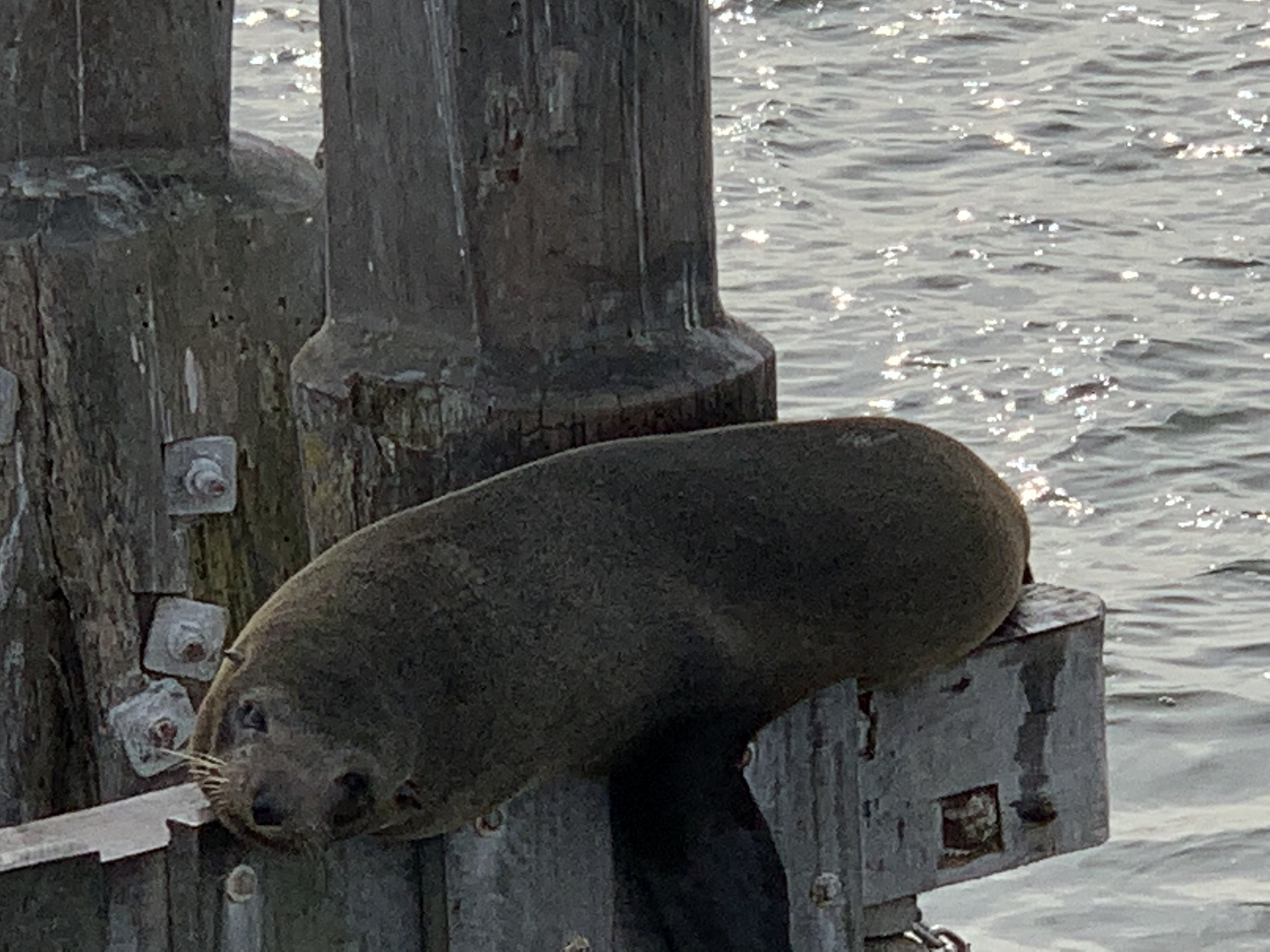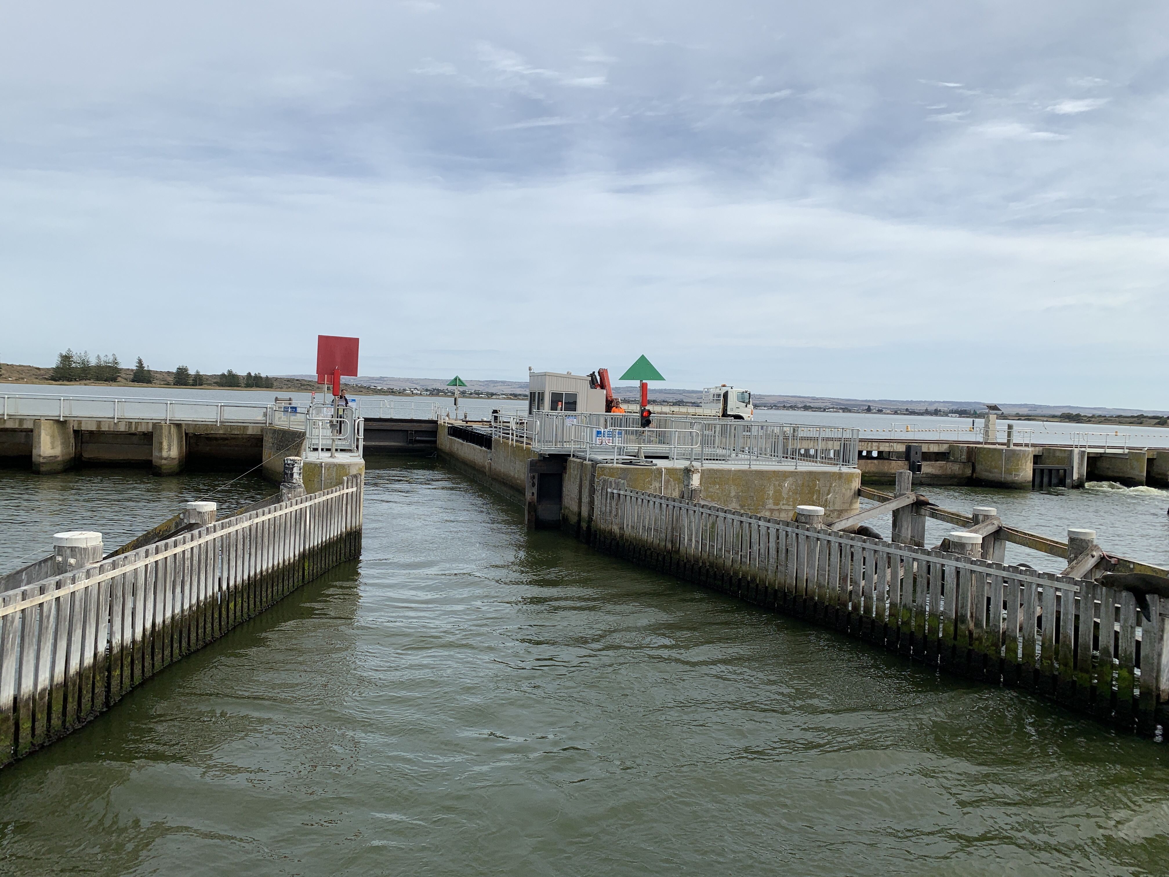 I love going through locks and this one was no exception. We had to be lowered from the fresh water river level to the sea water Coorong level. There was water flowing through one of the gates in the barrage and this is letting fresh water out into the Coorong. There was a group of sea lions at the lock hanging out on the wooden structure or playing in the water. They are funny to watch.