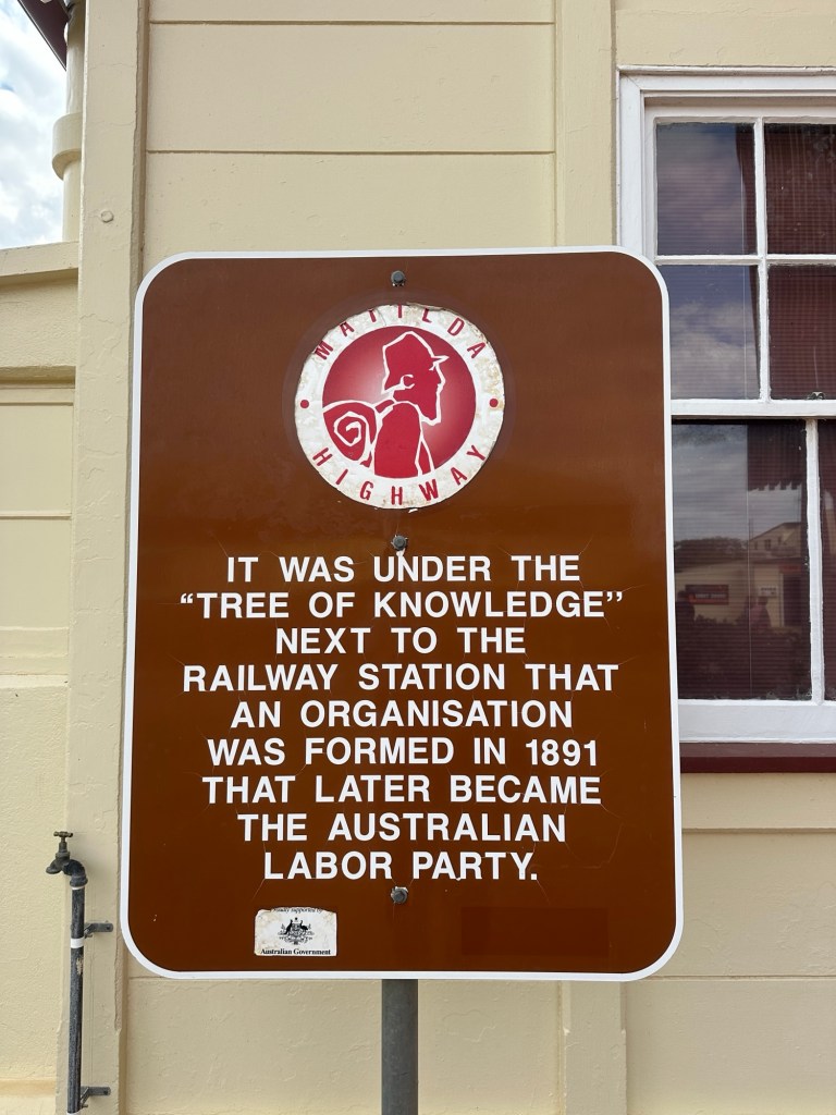On arrival in Barcaldine we parked up so we could visit the Tree of Knowledge. The Tree of Knowledge is a Ghost Gum that grew outside the Railway Station in Barcaldine. The tree has played an important role in the community over time as a meeting and gathering place. In the early years the tree was known as ‘The Hallelujah Tree’ because the Salvation Army held their services and band recitals under it. It kept this name into the 1940’s.