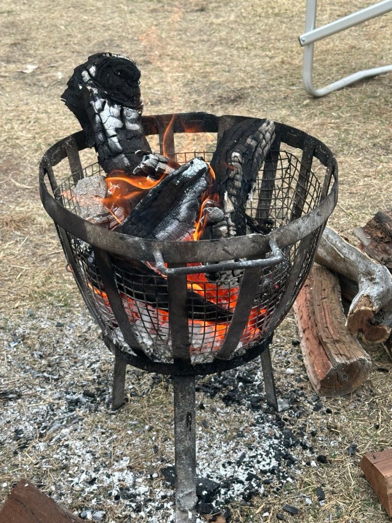 There are fire drums scattered around the campground made from 44 gallon drums cut in half with legs welded on the bottom to raise them off the ground. There was one near our camp so we set that up and Rich got the fire going.