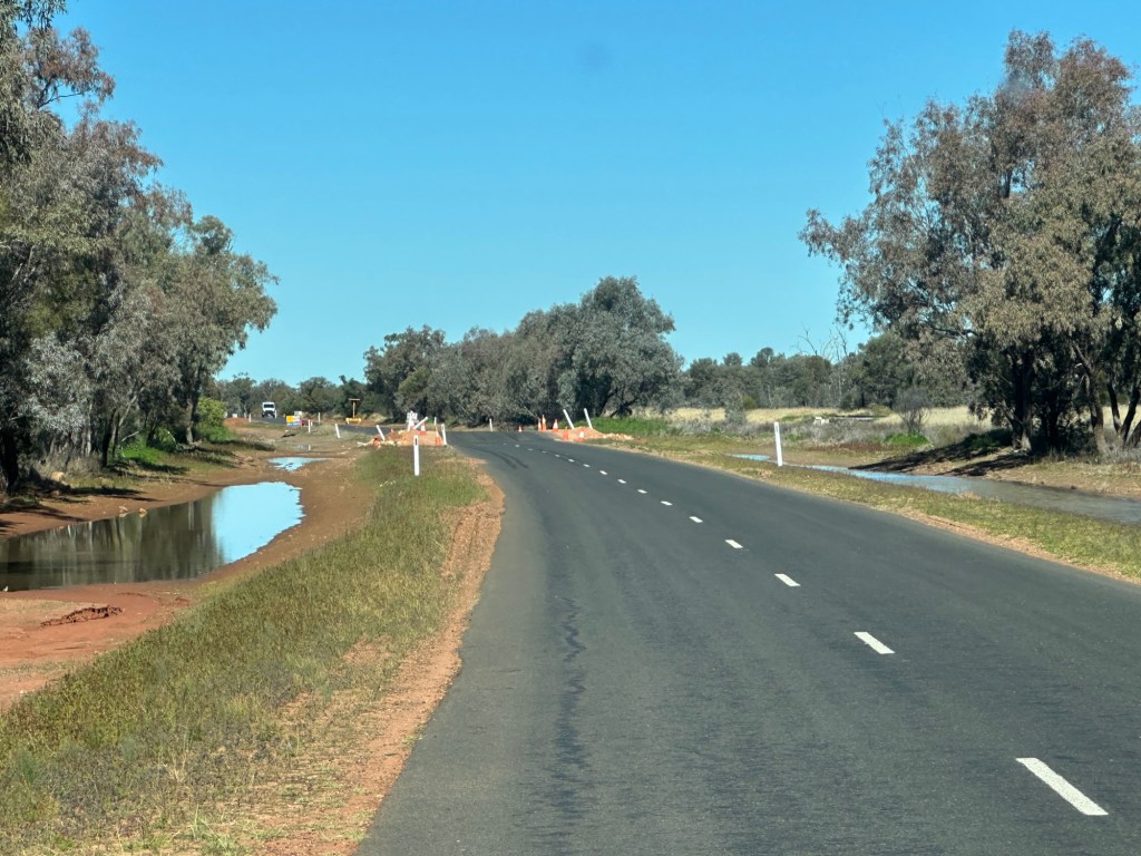 On the highway 120km from Cunnamulla there was water lying in large puddles on either side of the road . It looked like it had recently rained and the road had narrowed considerably. You wouldn’t want to drive off the road onto the muddy shoulder. You would sink!